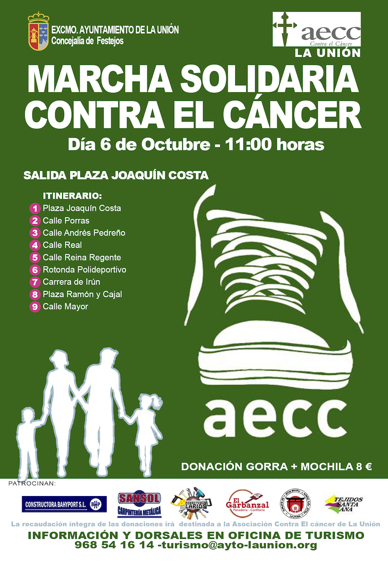 Las fiestas de La Unión, acogerán un año más la 'Marcha solidaria contra el cáncer'. Será el próximo domingo, 6 de octubre, a las 12:00 horas con salida desde la plaza Joaquín Costa y por el itinerario habitual. A la finalización actuará el grupo musical 'Cristofher'. Los dorsales se pueden retirar en la Oficina de Turismo junto con una bolsa y una gorra conmemorativas del evento. La donación es de 8 euros.