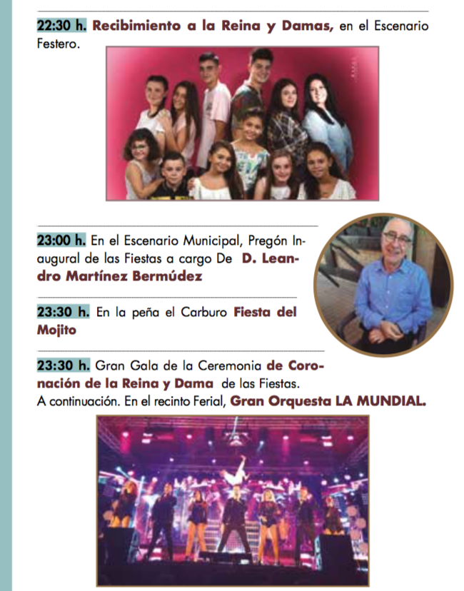En ese lugar se llevará a cabo la ceremonia de coronación de reinas y damas y después actuará la orquesta La Mundial. En cuanto a las peñas, El Carburo organiza esta noche la fiesta del mojito.