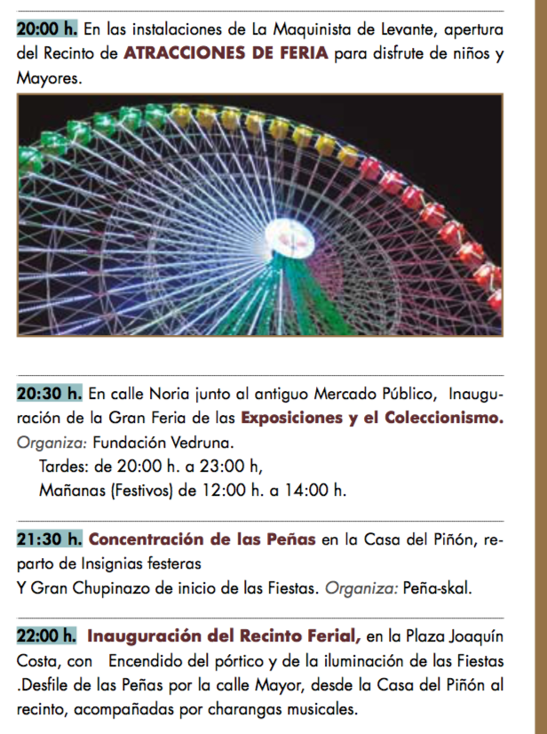 A las ocho de la tarde comenzarán a funcionar las atracciones de feria ubicadas en las instalaciones de la Maquinista de Levante. Media hora más tarde será inaugurada la muestra de coleccionismo que organiza Fundación Vedruna en la calle Noria y que se podrá visitar durante las jornadas festivas.