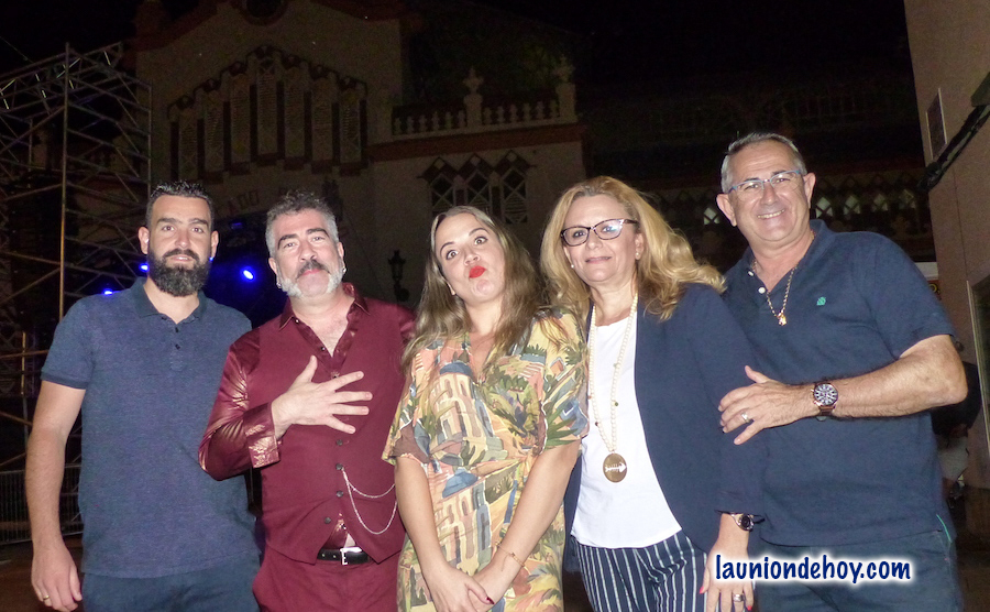 Agustín Jiménez y Martita de Graná protagonizaron la noche de monólogos de las Fiestas del Rosario, qyue atrajo a más de mil quinientas personas. A ambos se les observa en la imagen con integrantes de la peña El Desplante, con los que compartieron mesa en la cena, y del equipo de gobierno municipal.