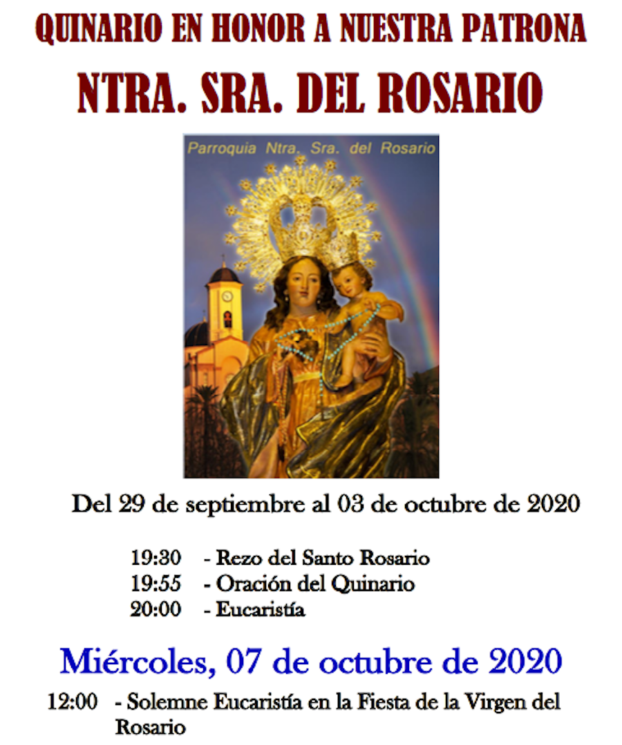 Por los motivos conocidos por todos, este no tendremos las Fiestas del Rosario en La Unión, pero la iglesia y su párroco, Ginés Luis Vicente, no quieren dejar en blanco un año como éste en el que tanta falta nos hace la ayuda divina y por ello del 29 de septiembre al 3 de octubre, va a tener lugar la celebración del quinario, con el rezo del rosario, oración del quinario y celebración eucarística. Para el día 7 del próximo mes, el gran día de la 'madre de los unionenses', a partir de las doce horas se celebrará una una solemne eucaristía en honor a la que también es alcaldesa perpetua del municipio.