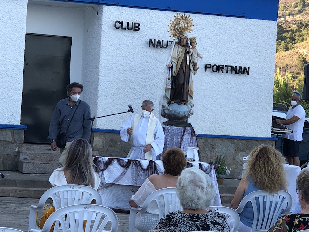 La banda de tambores de La Dolorosa de Portmán anunció la llegada de la Virgen a la explanada ubicada junto al club náutico en Portmán, donde se inició, oficiada por el sacerdote Andrés García, la misa en honor a la patrona de pescadores y, en general, de los hombres de la mar. El acto se cerró con los sones del himno de España.