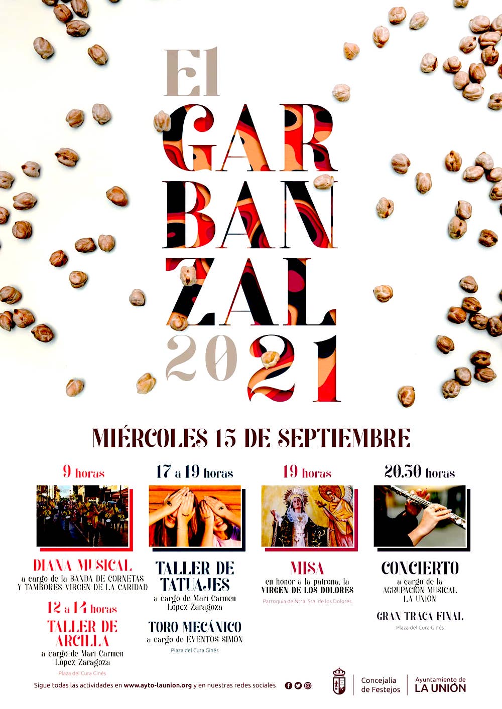 Jornada festiva en el municipio con epicentro en la villa, donde habrá diana musical, talleres de arcilla y tatuajes, toro mecánico, misa en honor a la Virgen de los Dolores, un concierto con doble temática musical y traca final. Organiza el Ayuntamiento de La Unión.