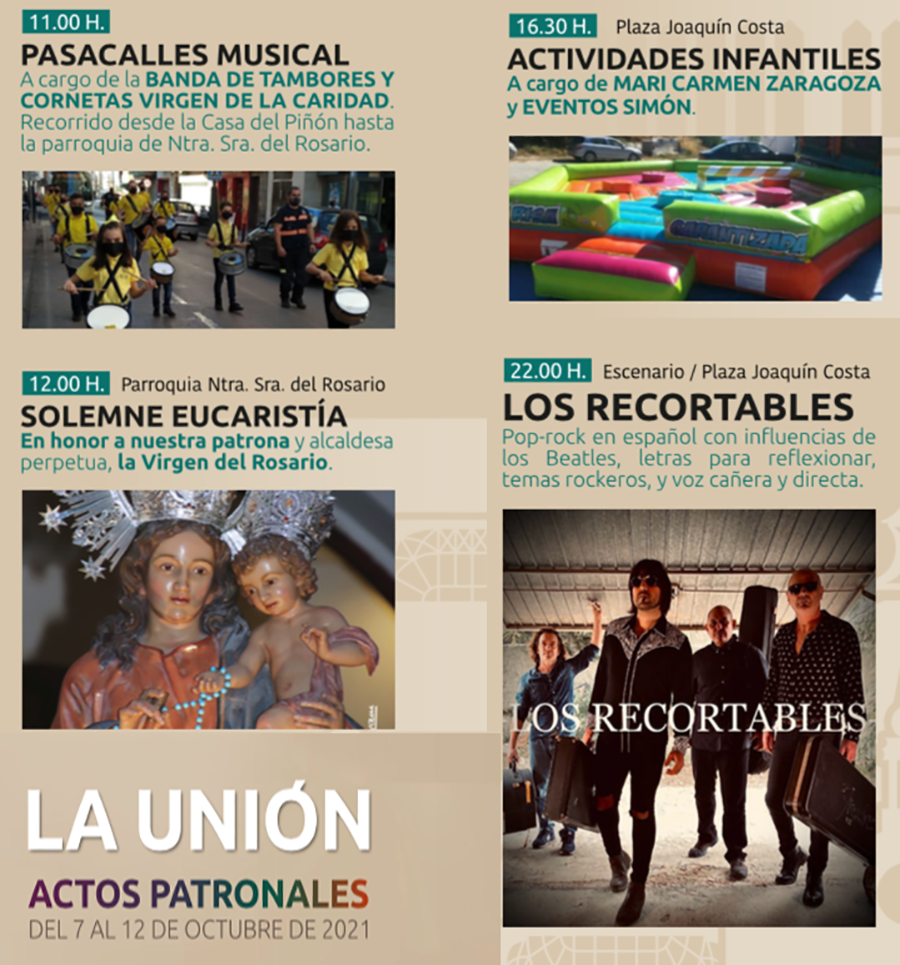 Vuelven los actos en honor a la patrona aderezados de actividad cultural y de ocio, pero no son las fiestas como se conocen, de ahí que el Ayuntamiento las haya identificado como 'actos patronales'. Hay una propuesta para los vecinos, pero con las medidas de seguridad sociosanitaria, evitando aglomeraciones, bailes y otros riesgos de contagio del coronavirus. Pese a todo, lo bueno es que estos días tendrán su aroma especial junto con el deseo de que sean un primer paso y servirán de encuentro de vecinos en lo que, ojalá, sea un tránsito hacia un 2022 de plena normalidad. El programa de hoy, día festivo en La Unión, lo abre el pasacalles de la banda Virgen de la Caridad, lo continúa la misa solemne en honor a la Virgen de Rosario, continuará con actividades infantiles y lo cerrará el concierto de 'Los recortables'.