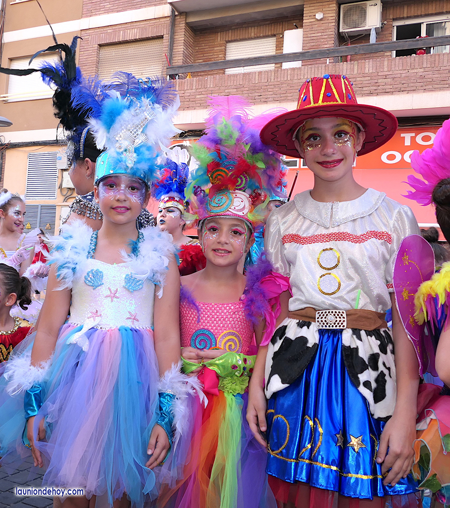 Sofía García y los hermanos Carmen y Lola Martínez Nicolás participaron ayer en el gran desfile del Carnaval de Cartagena dentro de la comparsa MarDance de El Algar.