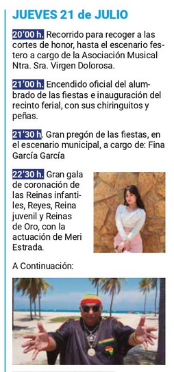 La inauguración del alumbrado y del recinto festero, el pregón de Fina García, la gala de proclamación de la corte de honor y la actuación de King África, entre otras actividades, marcan la primera jornada de unos festejos que, debido a la pandemia del coronavirus, no se celebran desde el año 2019 y que se prolongarán hasta el lunes, día de Santiago Apóstol.