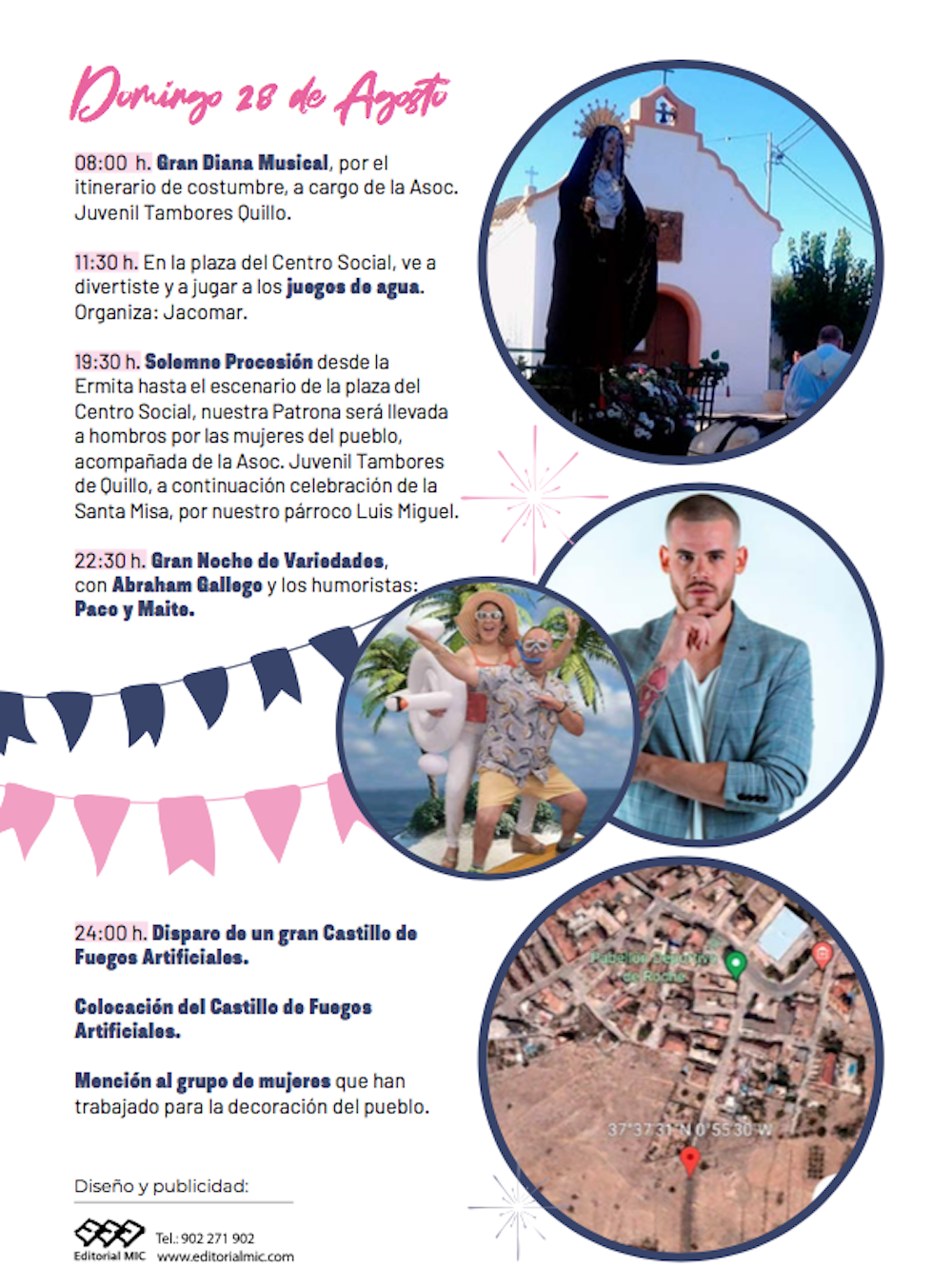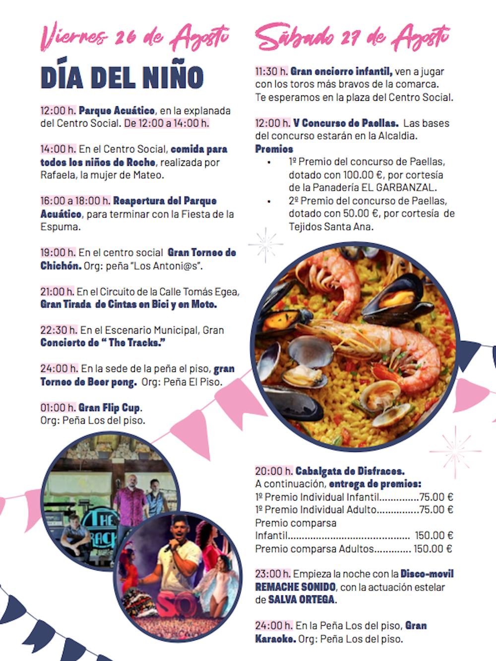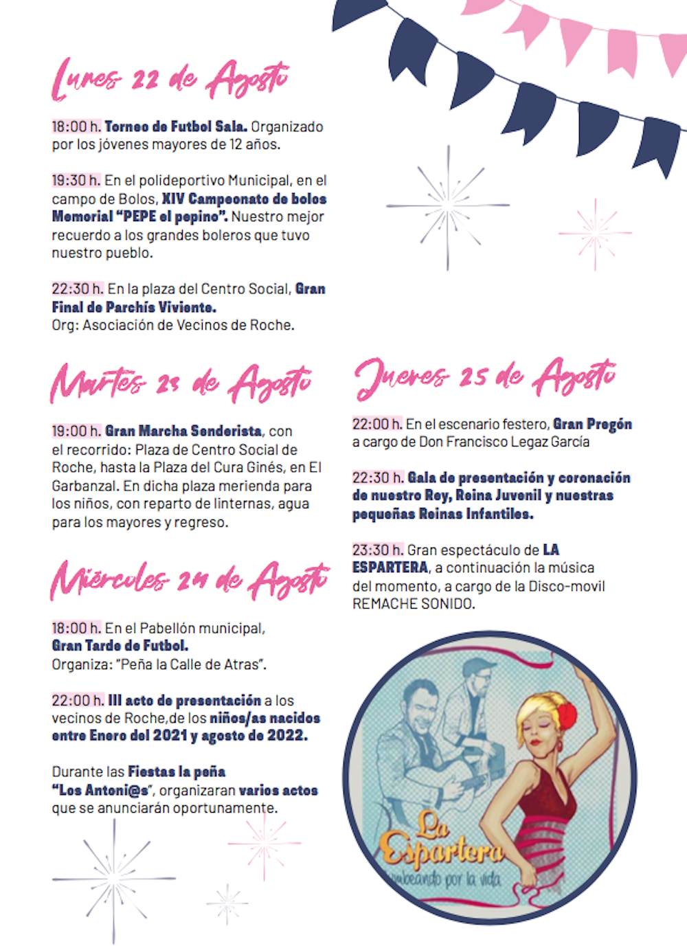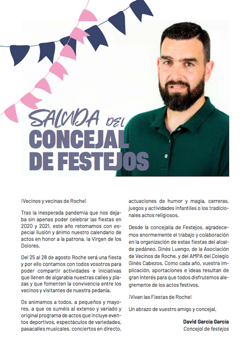 Ofrecemos las fechas y los horarios de las actividades programadas por la concejalía de Festejos entre los domingos 21 y 28 de este mes, cuando vuelven unas celebraciones que no tienen lugar desde 2019. También se incluyen los saludas del alcalde, del concejal, del pedáneo y del párroco invitando a los vecinos a disfrutar estas fechas de convivencia y a los visitantes a sumarse a ellas.