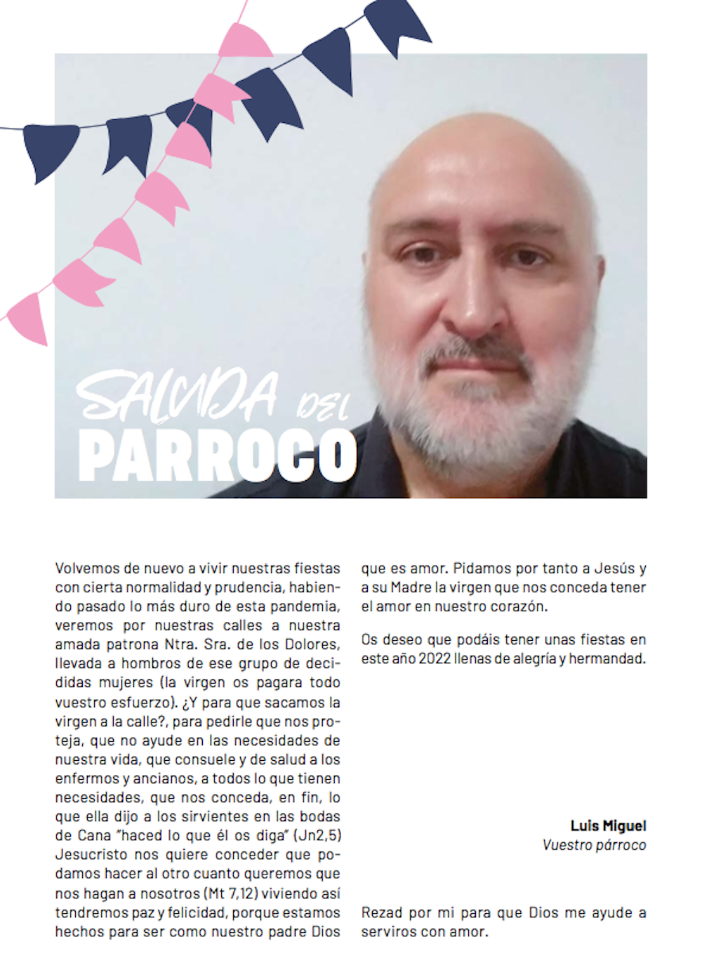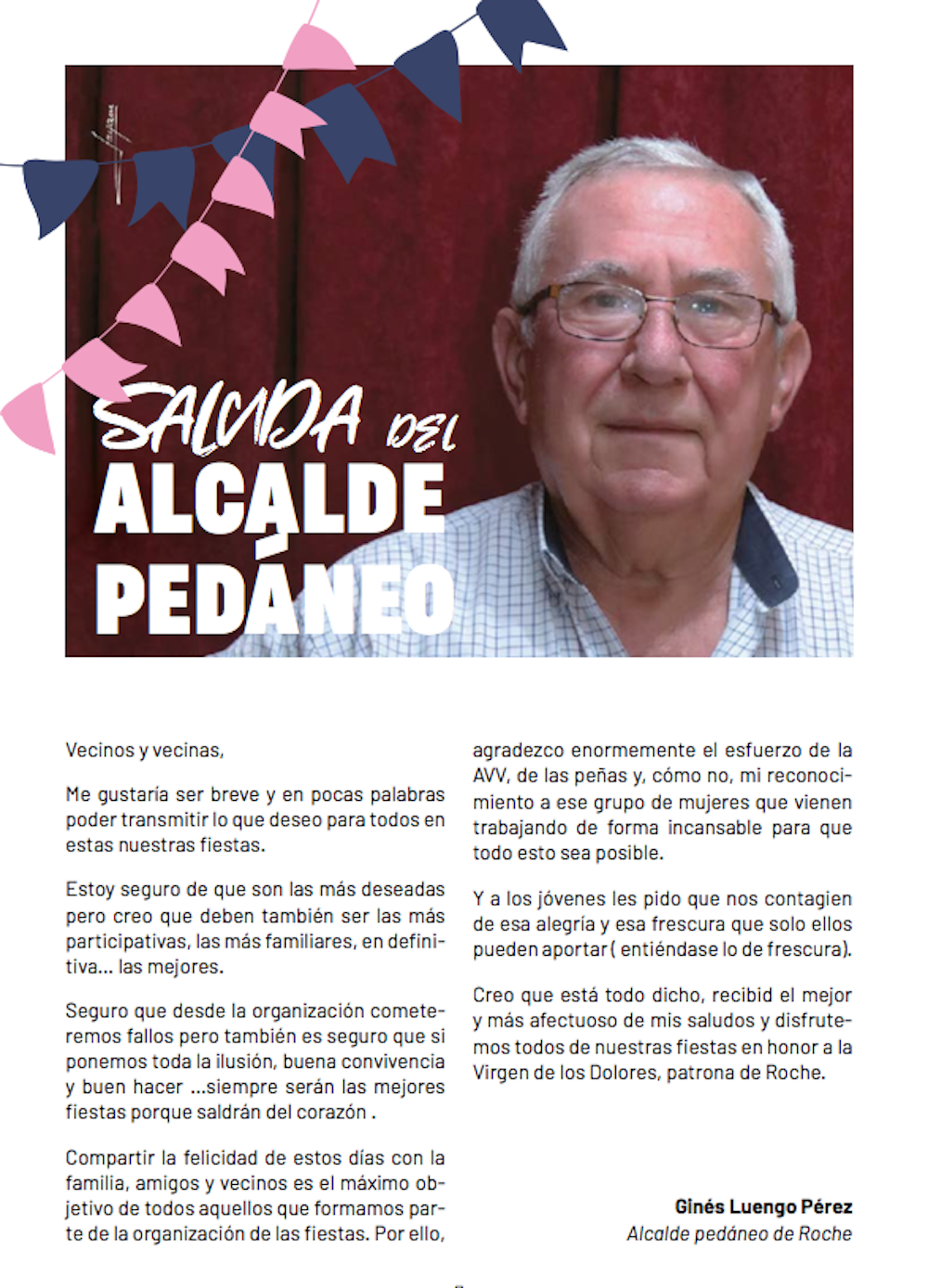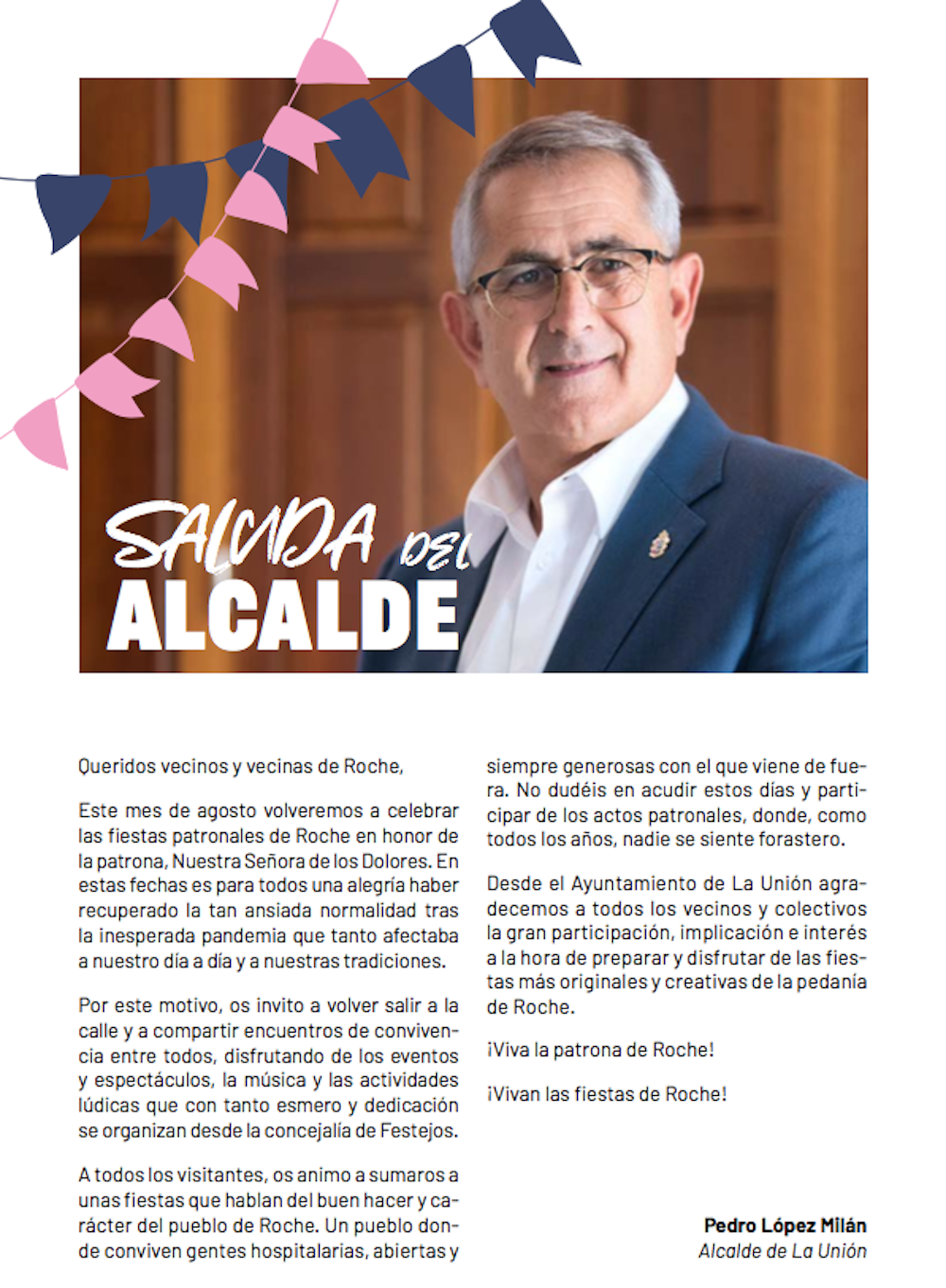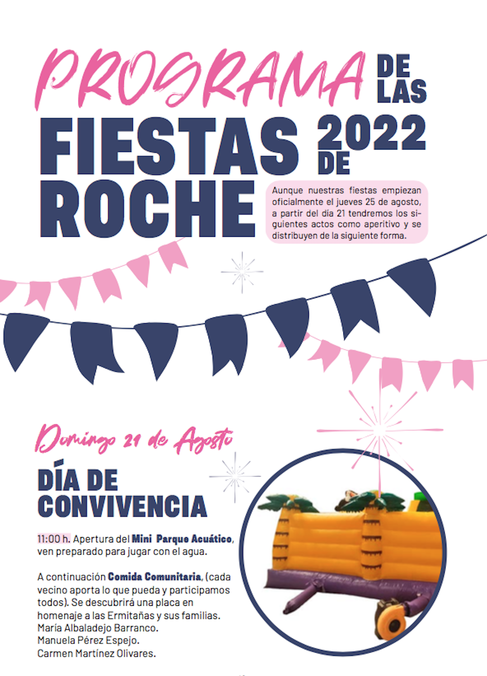 Ofrecemos las fechas y los horarios de las actividades programadas por la concejalía de Festejos entre los domingos 21 y 28 de este mes, cuando vuelven unas celebraciones que no tienen lugar desde 2019. También se incluyen los saludas del alcalde, del concejal, del pedáneo y del párroco invitando a los vecinos a disfrutar estas fechas de convivencia y a los visitantes a sumarse a ellas.