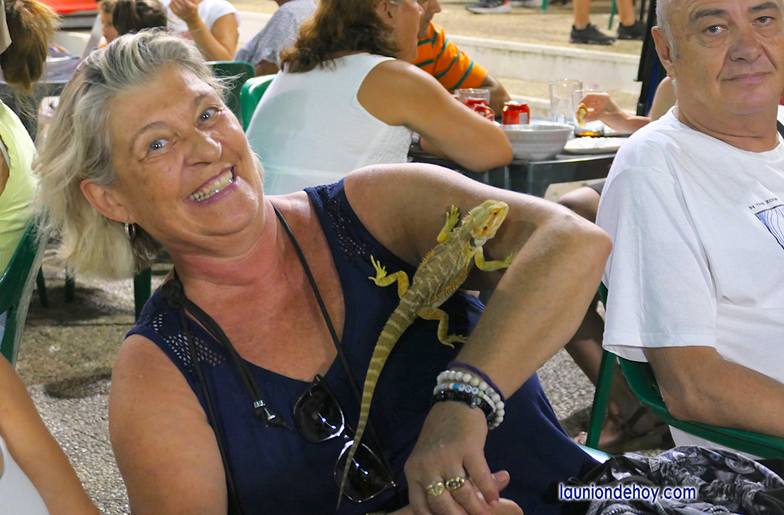 El dragón barbudo 'Dino' no se perdió la agradable noche rochera de ayer. Su amo es el joven Pablo Álamo, quien ha venido desde Zaragoza con su padre, Gampe, y estaban disfrutando de la velada con su abuela y otros familiares y amigos.