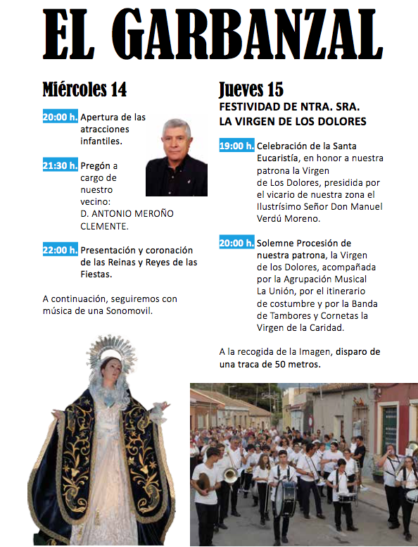 Tras el paréntesis pandémico, hoy regresan las fiestas patronales a la tierra cuya denominación procede de los cultivos de garbanzos que iniciaron los romanos hace muchos siglos. Tras la apertura de las atracciones infantiles, el escenario de la plaza del Cura Ginés acogerá el pregón de Antonio Meroño y la presentación y coronación de reinas y reyes de esta edición.