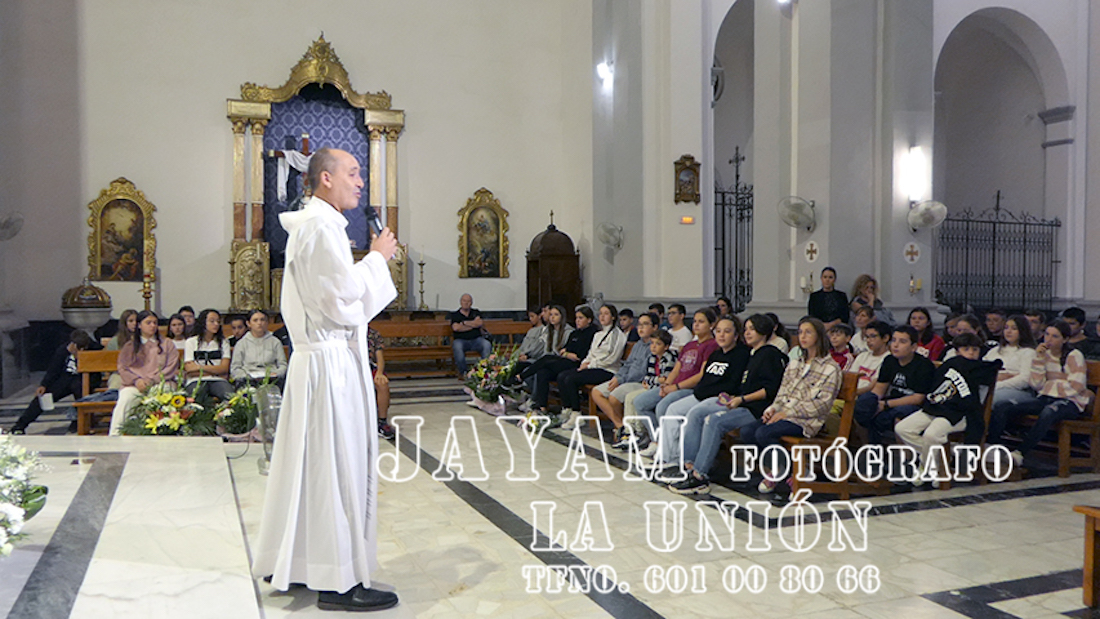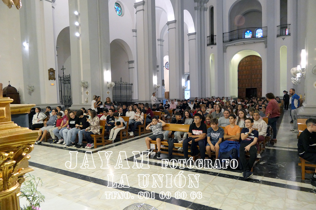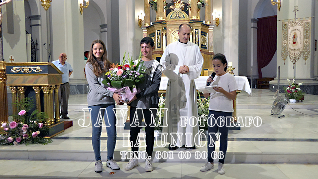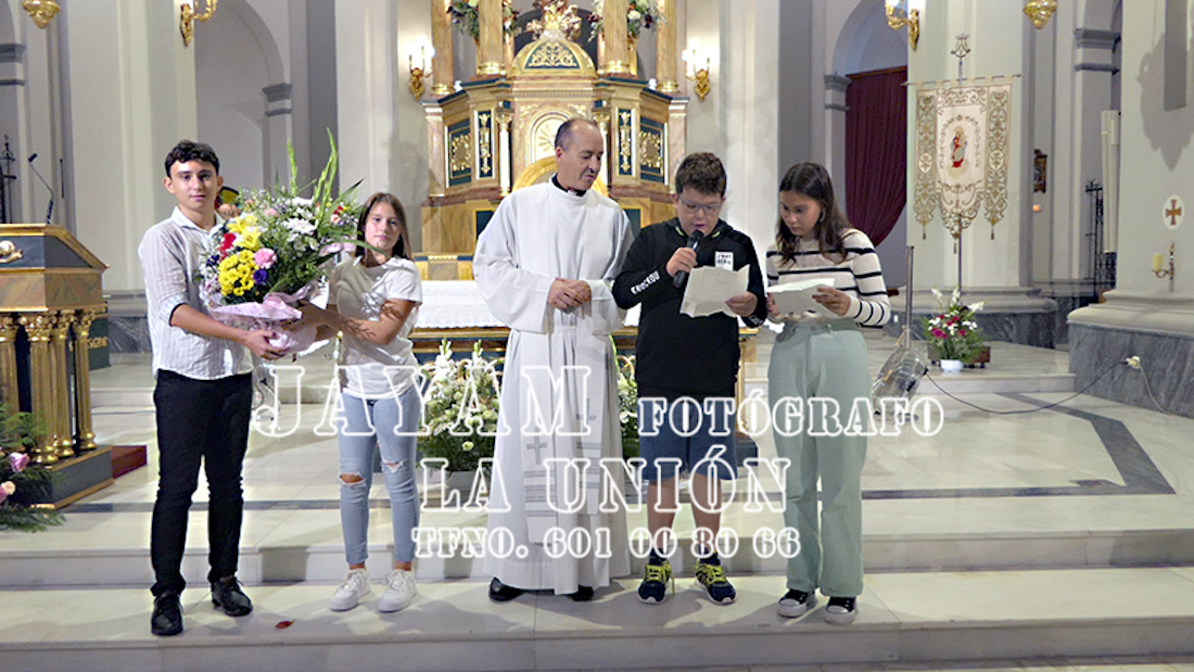 Debido a la lluvia que estaba teniendo lugar en esos momentos, sólo han podido acudir los escolares mayores de Carmelitas al templo de la patrona, donde han escuchado al párroco, Ginés Luis Vicente, y donde han llevado a cabo la floreada ofrenda y recitado los poemas a los pies de la Virgen.