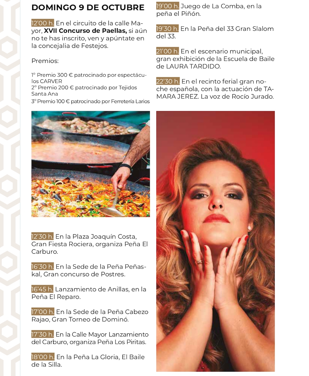Es el gran día de los arroces, cuyo concurso alcanza las diecisiete ediciones, con premios de 300, 200 y 100 euros para los tres mejores elegidos por el jurado. También habrá fiesta rociera en la peña 'El Carburo'. Por la tarde, más actividades en las peñas, como el baila de la silla, el concurso de postres, el dominó, la comba, el gran slalom y los torneos de lanzamientos de carburos y de anillas. Seguirá la actividad con baile y con la actuación de Tamara de Jerez en tributo a Rocío Jurado.