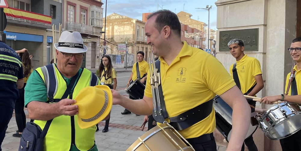 La anécdota de esta diana, (como podemos ver en las primeras imágenes), fue protagonizada por Paco “el cohetero” y el director de esta banda Jose Antonio Martínez, quien antes del inicio de la diana regaló un sombrero personalizado de esta banda, al conocido cohetero que desde el año 2015, acompaña con los cohetes a esta banda, en todas aquellas dianas y diferentes desfiles que realizan tanto en el municipio de La Unión, como en la Villa de El Garbanzal o en la pedanía unionense de Roche. El conocido cohetero Paco, el cual es un amante de este estilo de sombreros, no dudó en quitarse el que llevaba y colocarse este último que lo acompañó durante todo el festivo día del Rosario. Paco, además, agradeció tan bonito detalle con unas bonitas palabras para esta banda en las que reiteró que para él esta banda es única por su profesionalidad, seriedad, toque y orden entre otras cosas y que siempre se alegra mucho cuando sabe que en algún acto va a acompañar a esta banda de la que oficialmente se declaró fan número uno y de la que a la que declaró tener un gran cariño.