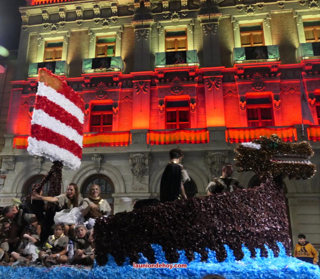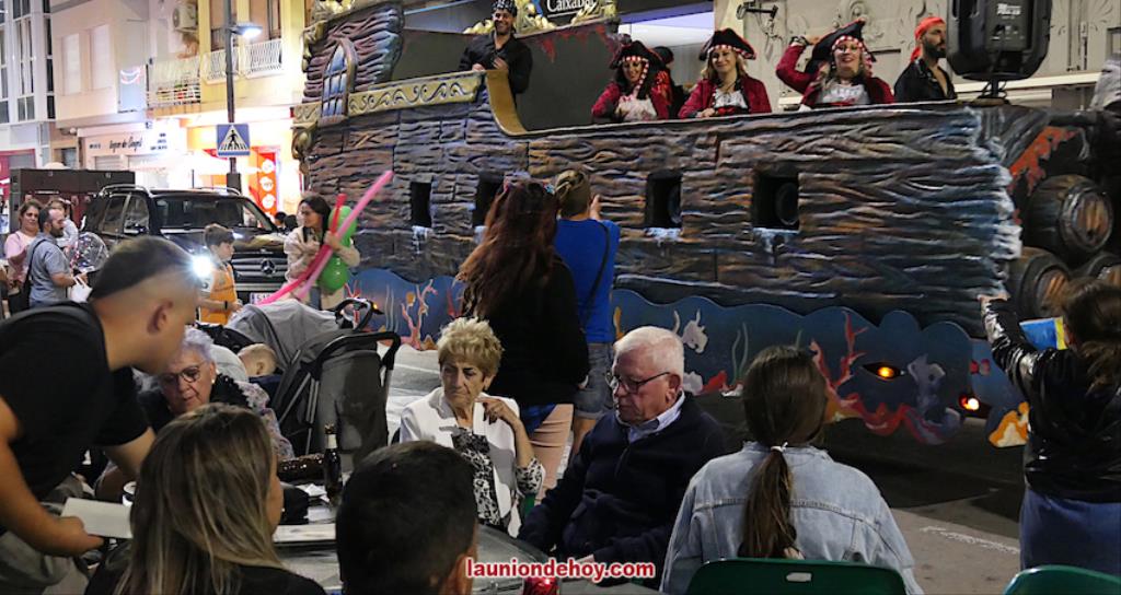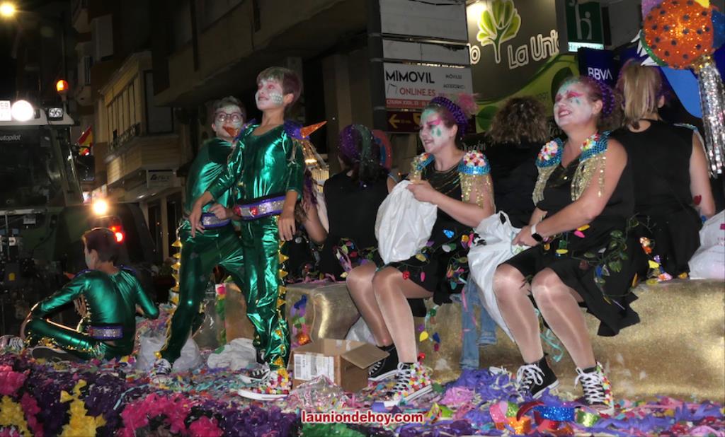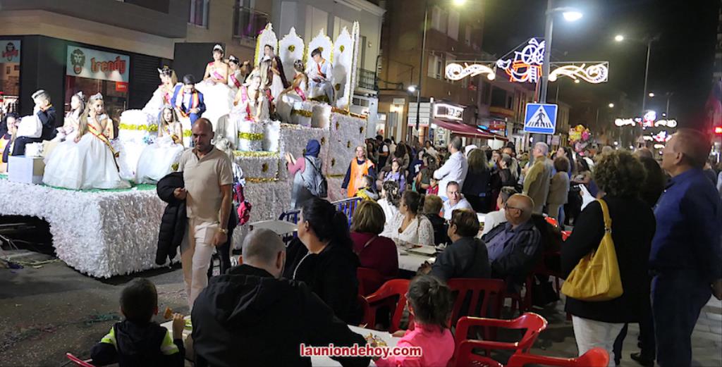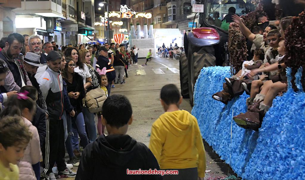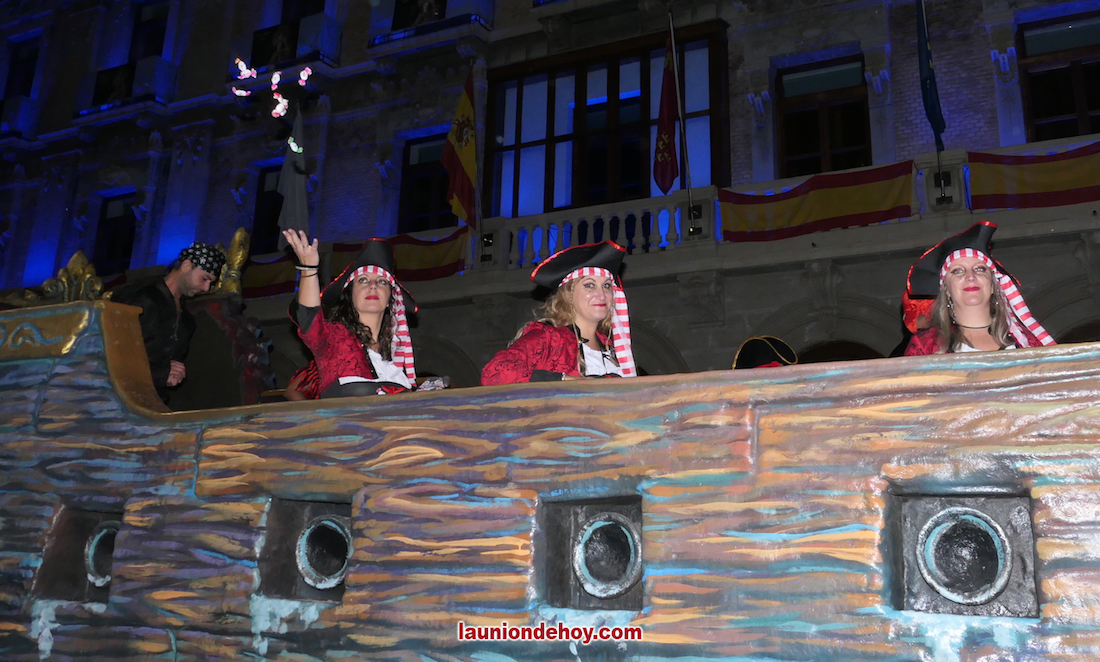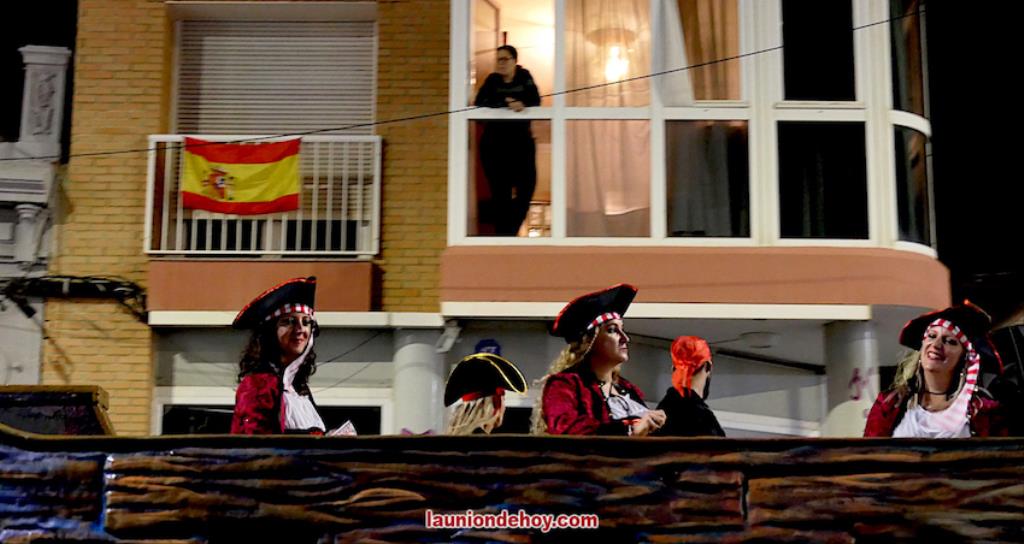 En cabeza, detrás de efectivos de Protección Civil y un coche patrulla de la Policía Local, iba la banda de música de la agrupación del Cristo de los mineros, comenzando a continuación la sucesión de carrozas unionenses tiradas por tractores, como Valkiria, Galera, Destellos y las cuatro que llevaban a la ‘realeza festera’. Hay que añadir las dos de las comparsas ‘Fantasía a color’ y ‘Peché’ de la vecina localidad del Llano del Beal y el barco pirata de la Federación de Peñas de La Unión.