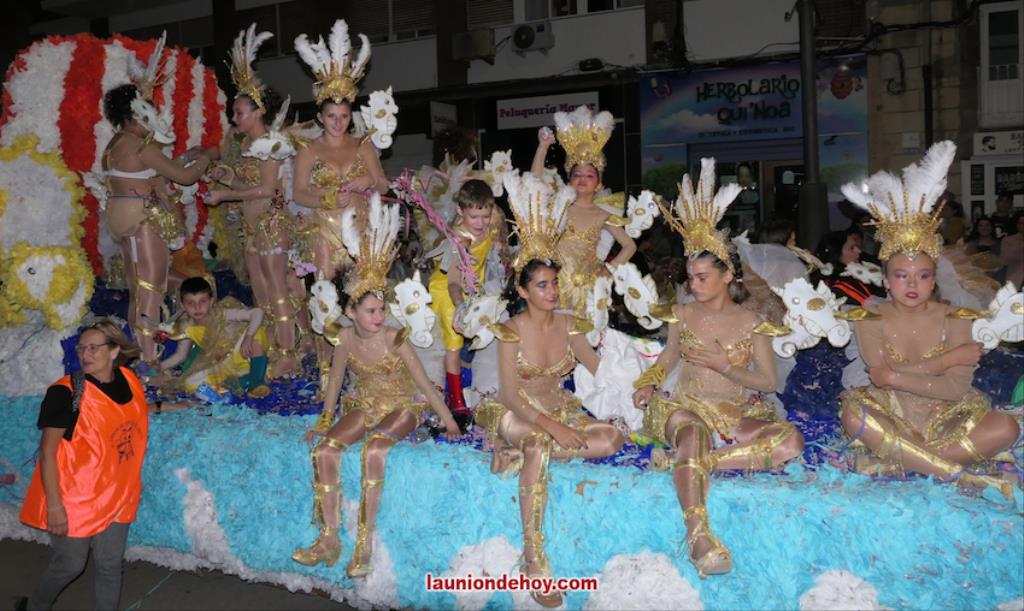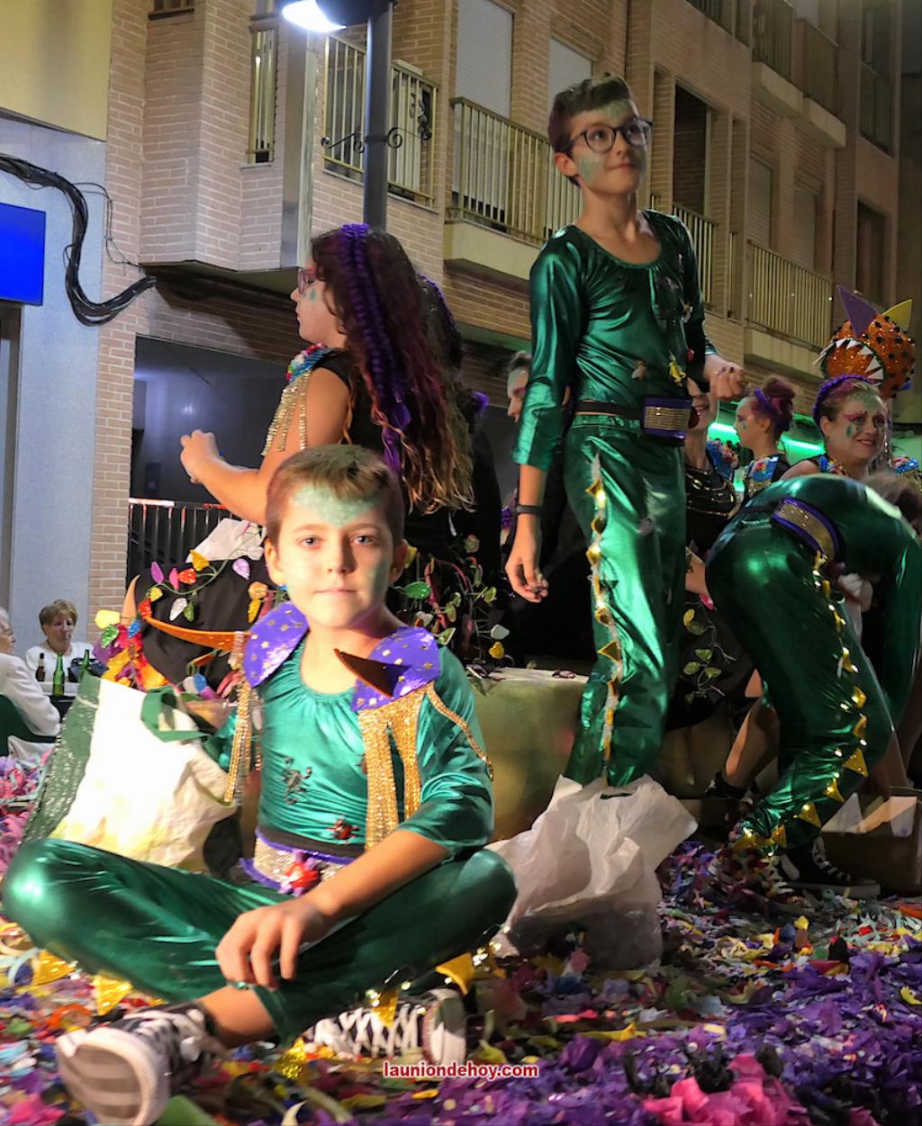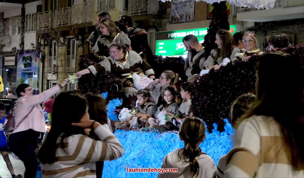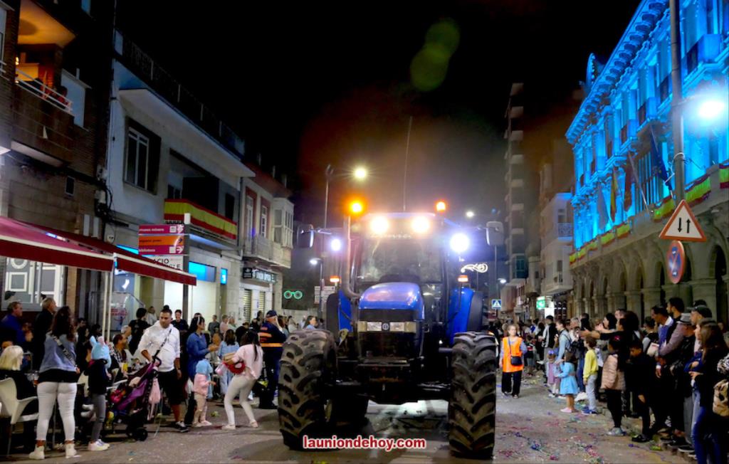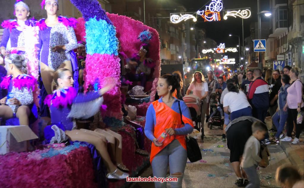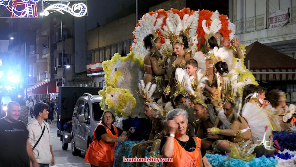 En cabeza, detrás de efectivos de Protección Civil y un coche patrulla de la Policía Local, iba la banda de música de la agrupación del Cristo de los mineros, comenzando a continuación la sucesión de carrozas unionenses tiradas por tractores, como Valkiria, Galera, Destellos y las cuatro que llevaban a la ‘realeza festera’. Hay que añadir las dos de las comparsas ‘Fantasía a color’ y ‘Peché’ de la vecina localidad del Llano del Beal y el barco pirata de la Federación de Peñas de La Unión.
