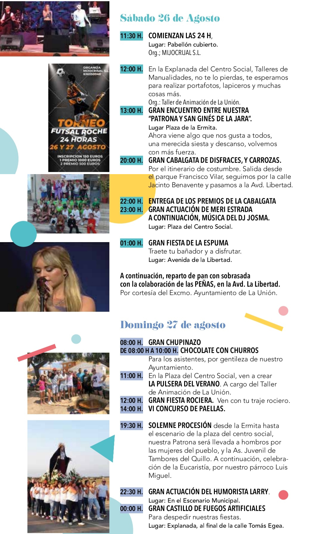 Las fiestas afronta sus dos jornadas con más actividades, que van desde la cabalgata la fiesta de la espuma y el torneo de 24 horas en el pabellón a la fiesta rociera y al concurso de arroces de un domingo que también tendrá su hueco para el humor. La Virgen también es protagonista. Hoy recibirá a San Ginés de la Jara y mañana recorrerá su pueblo en procesión.