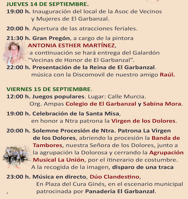 La primera noche festera de la villa tendrá como protagonistas a la artista unionense Antonia Esther Martínez, que será quien ofrezca el pregón, y a la elegida para el galardón de ‘Vecina de honor’, además de la presentación de la corte de honor con sus rey y reina (foto adjunta). Completará la velada la música que pinchará Dj Rául. El viernes comenzará la actividad por la mañana con juegos populares y por la tarde llegará la misa y la procesión con la patrona, culminado con una verbena amenizada por ‘Dúo Clandestino’.