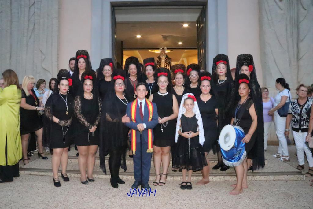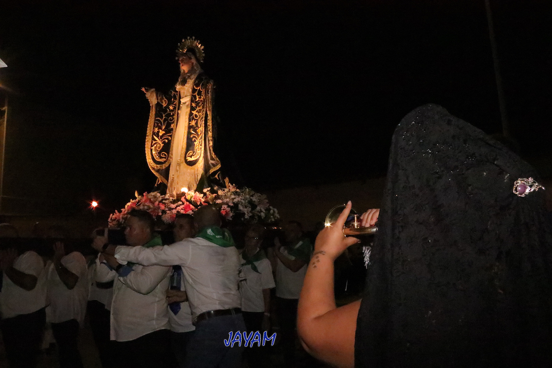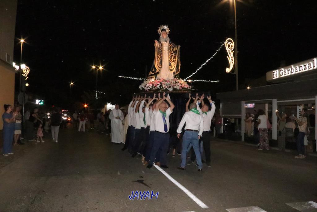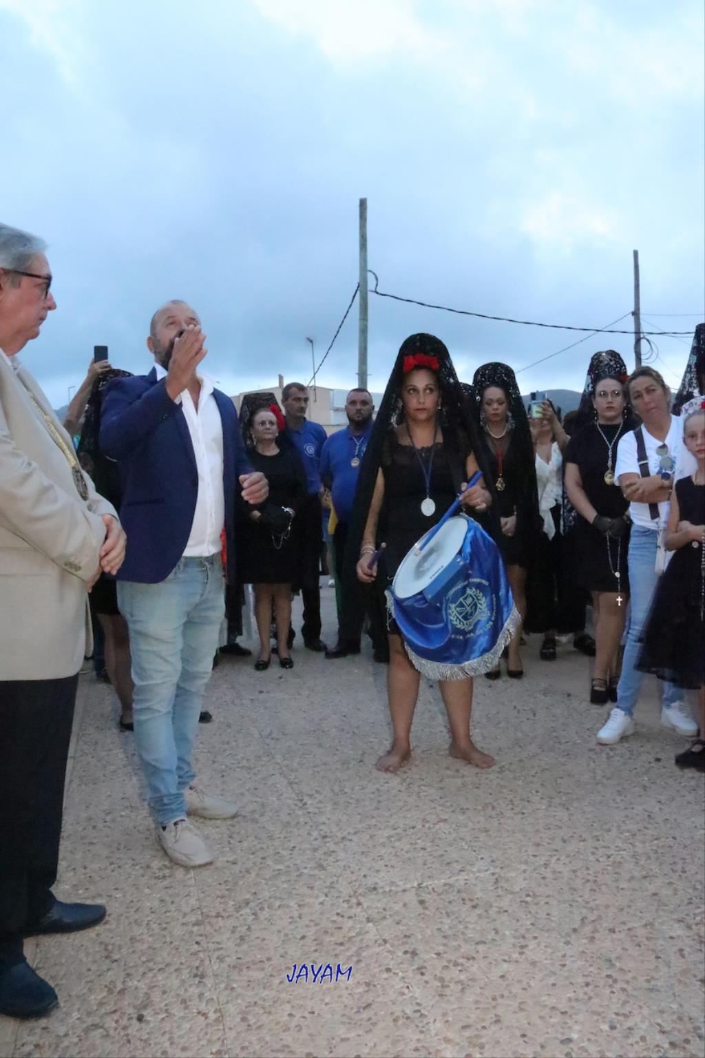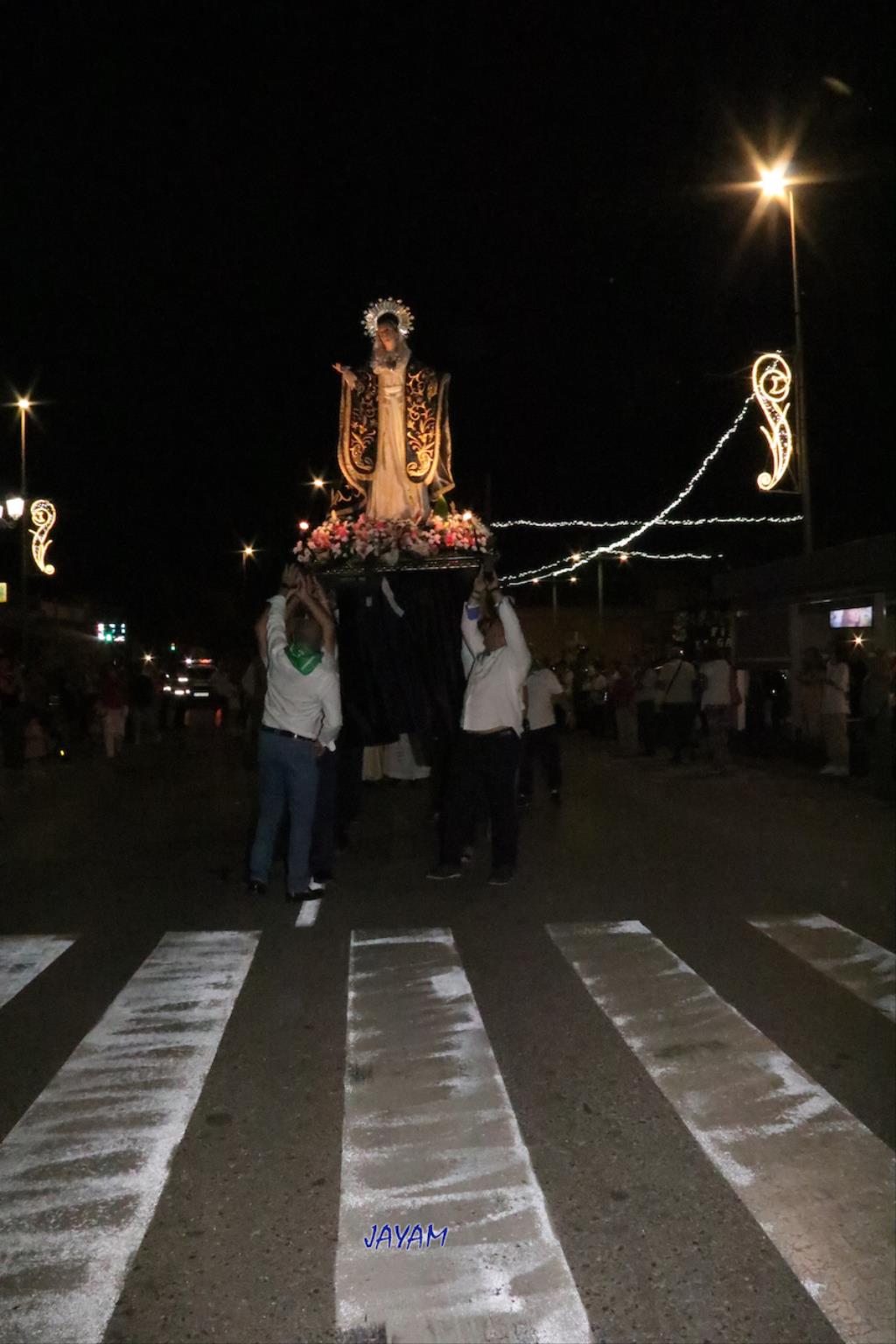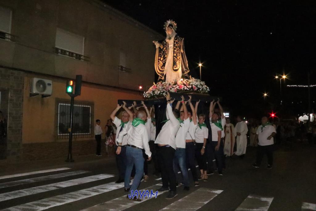 Después, salida del trono con gran expectación y sonido de saetas acompañadas por tambor golpeado por una descalza 'manola' de la banda 'dolorosa' y recorrido por la villa, para a la vuelta, ser cantada la Salve a la patrona al recogerse, culminando el rezo con 'vivas', piropos y aplausos dedicados a la imagen