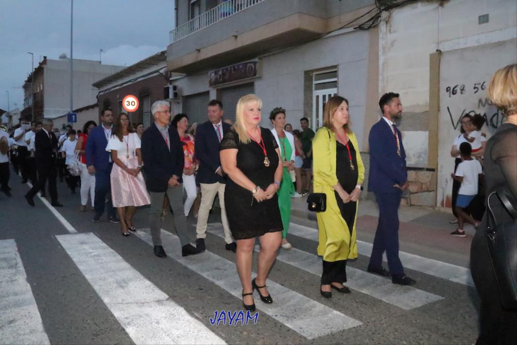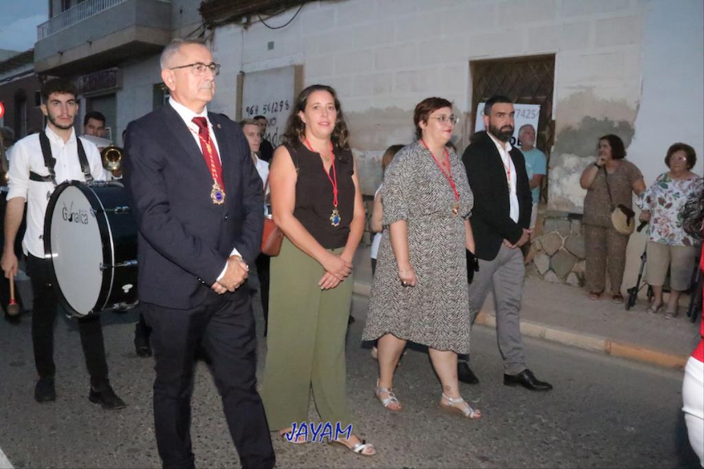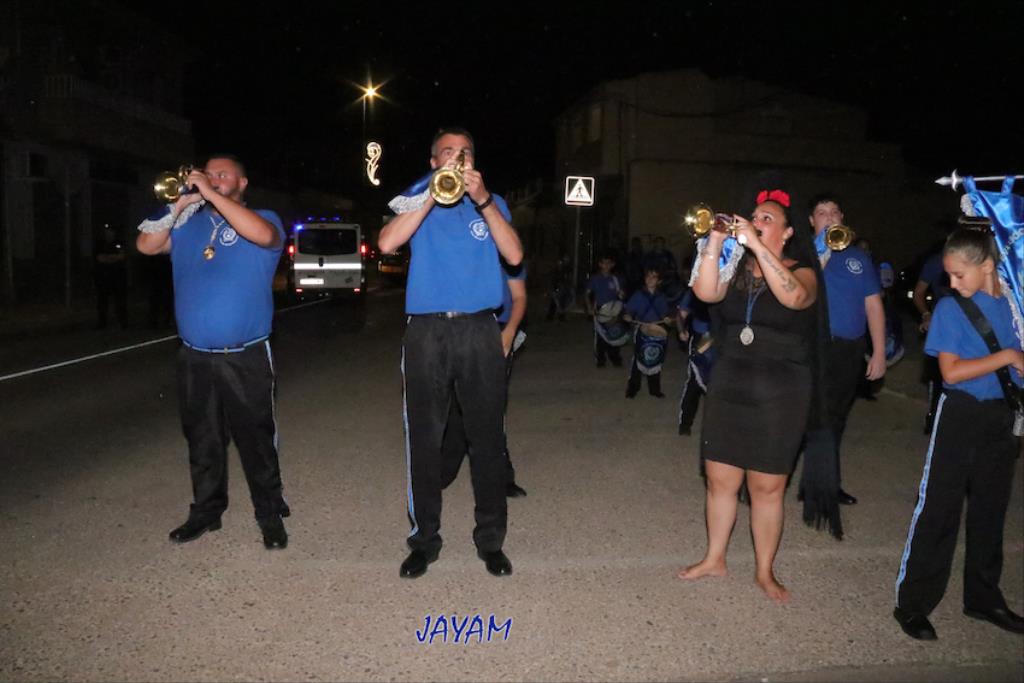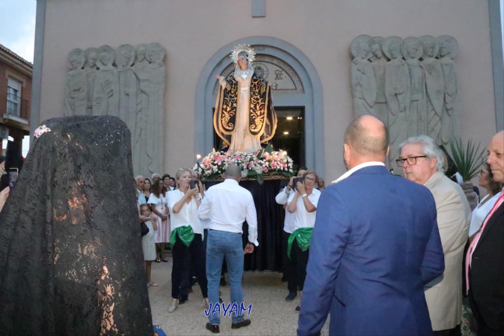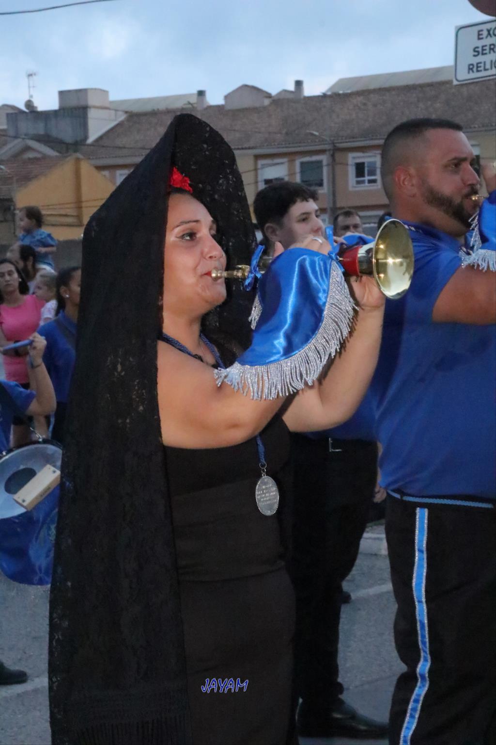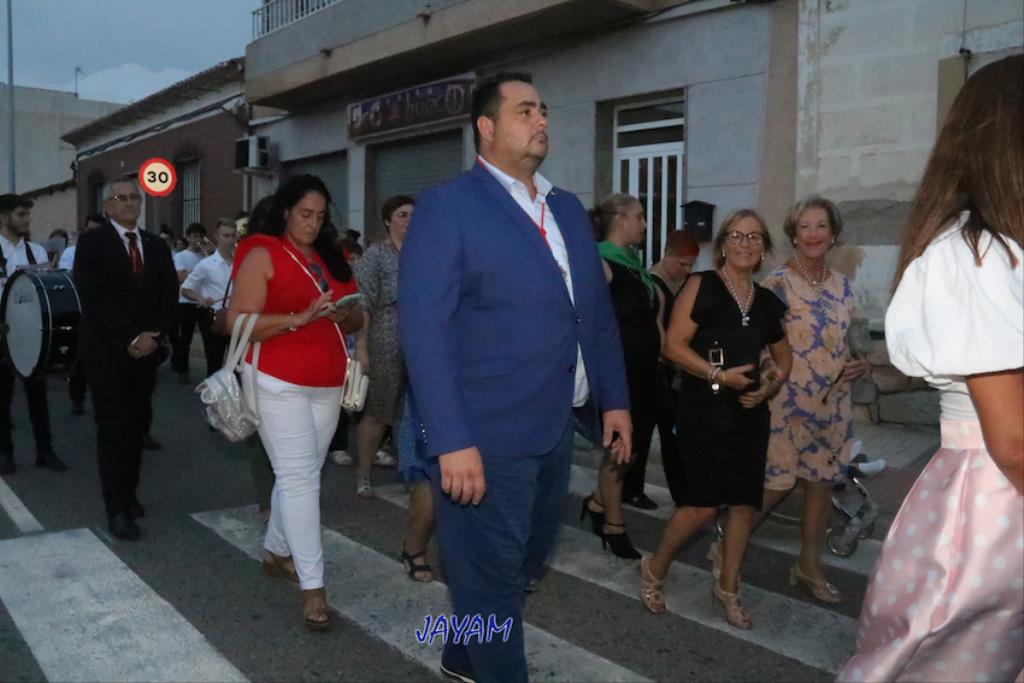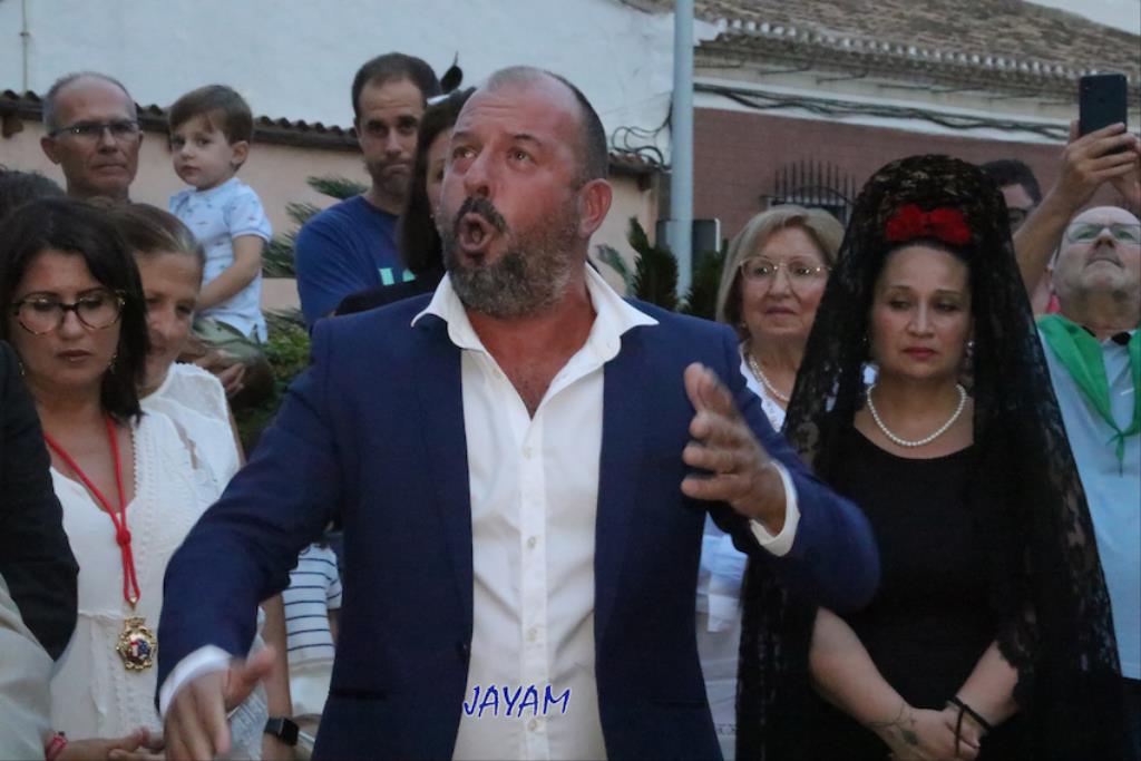 Después, salida del trono con gran expectación y sonido de saetas acompañadas por tambor golpeado por una descalza 'manola' de la banda 'dolorosa' y recorrido por la villa, para a la vuelta, ser cantada la Salve a la patrona al recogerse, culminando el rezo con 'vivas', piropos y aplausos dedicados a la imagen