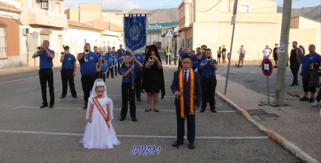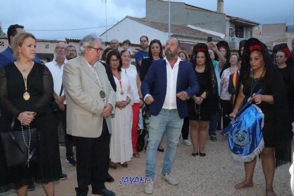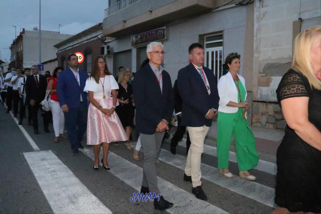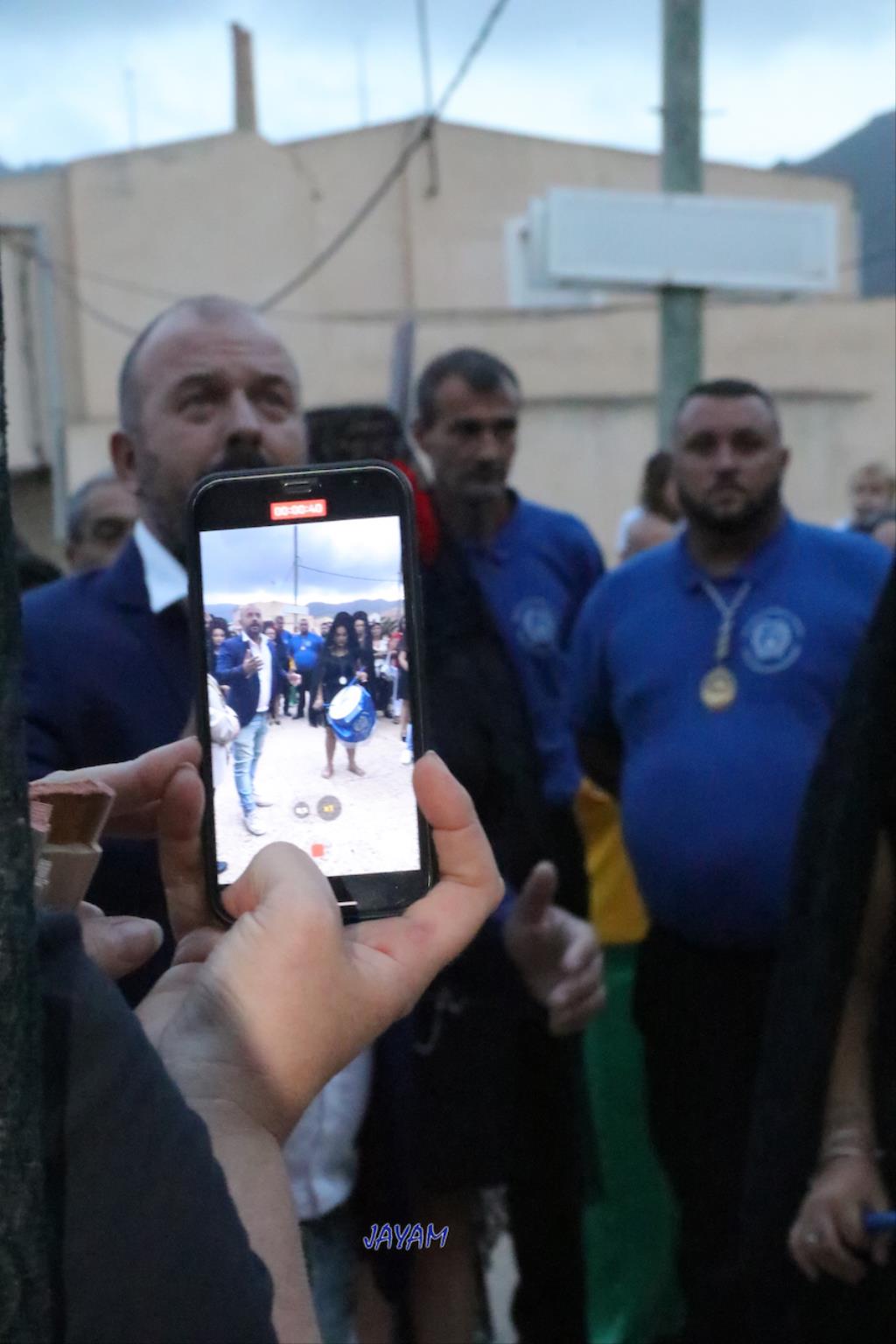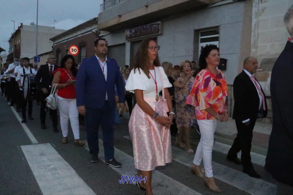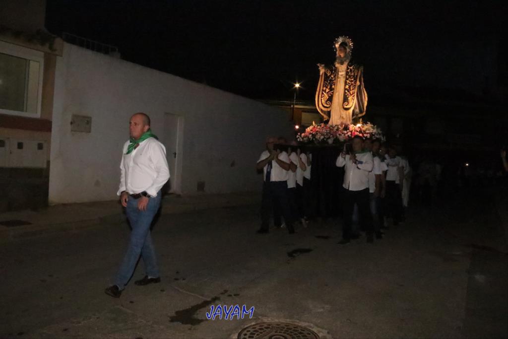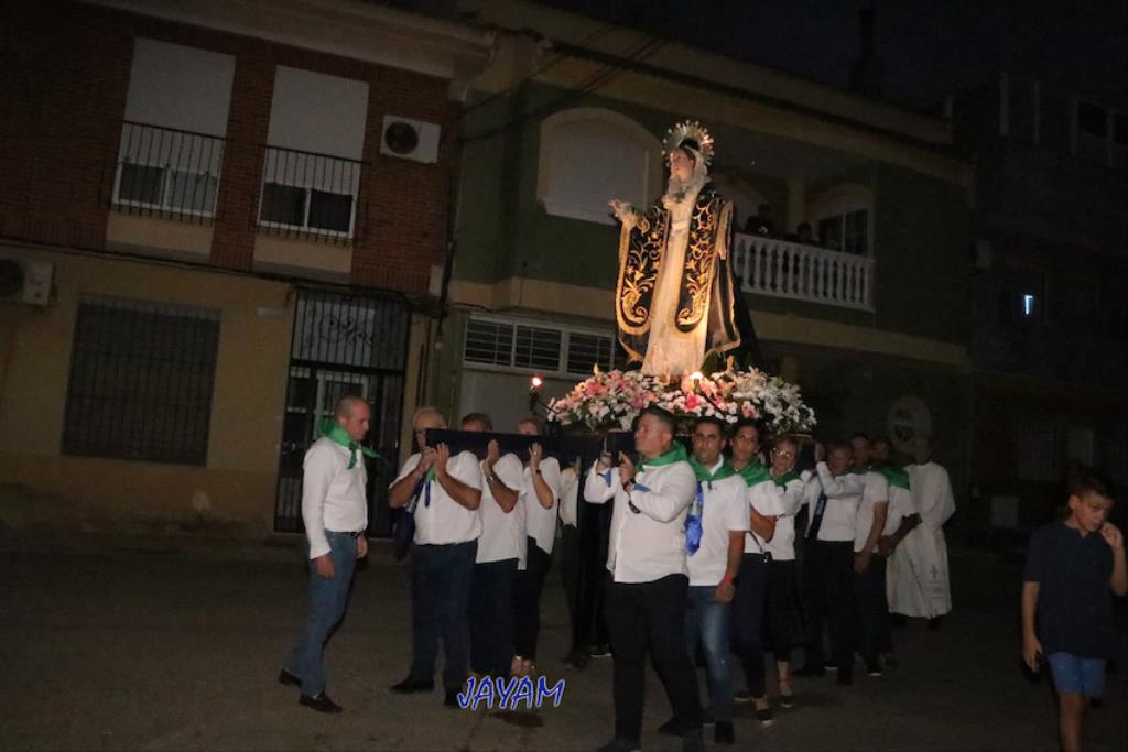 Después, salida del trono con gran expectación y sonido de saetas acompañadas por tambor golpeado por una descalza 'manola' de la banda 'dolorosa' y recorrido por la villa, para a la vuelta, ser cantada la Salve a la patrona al recogerse, culminando el rezo con 'vivas', piropos y aplausos dedicados a la imagen