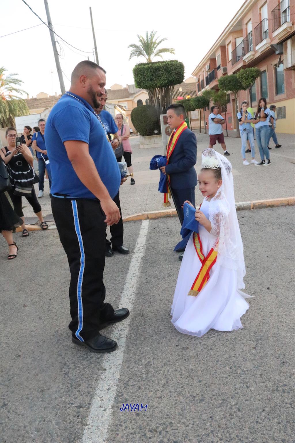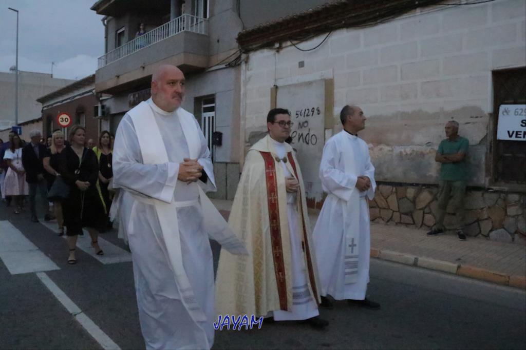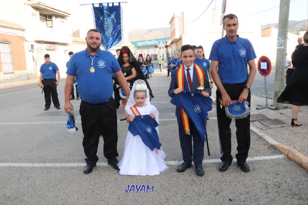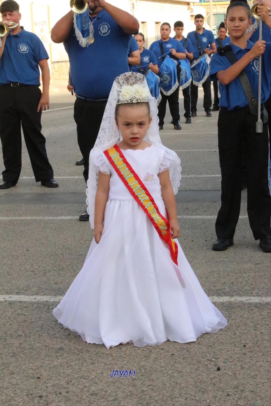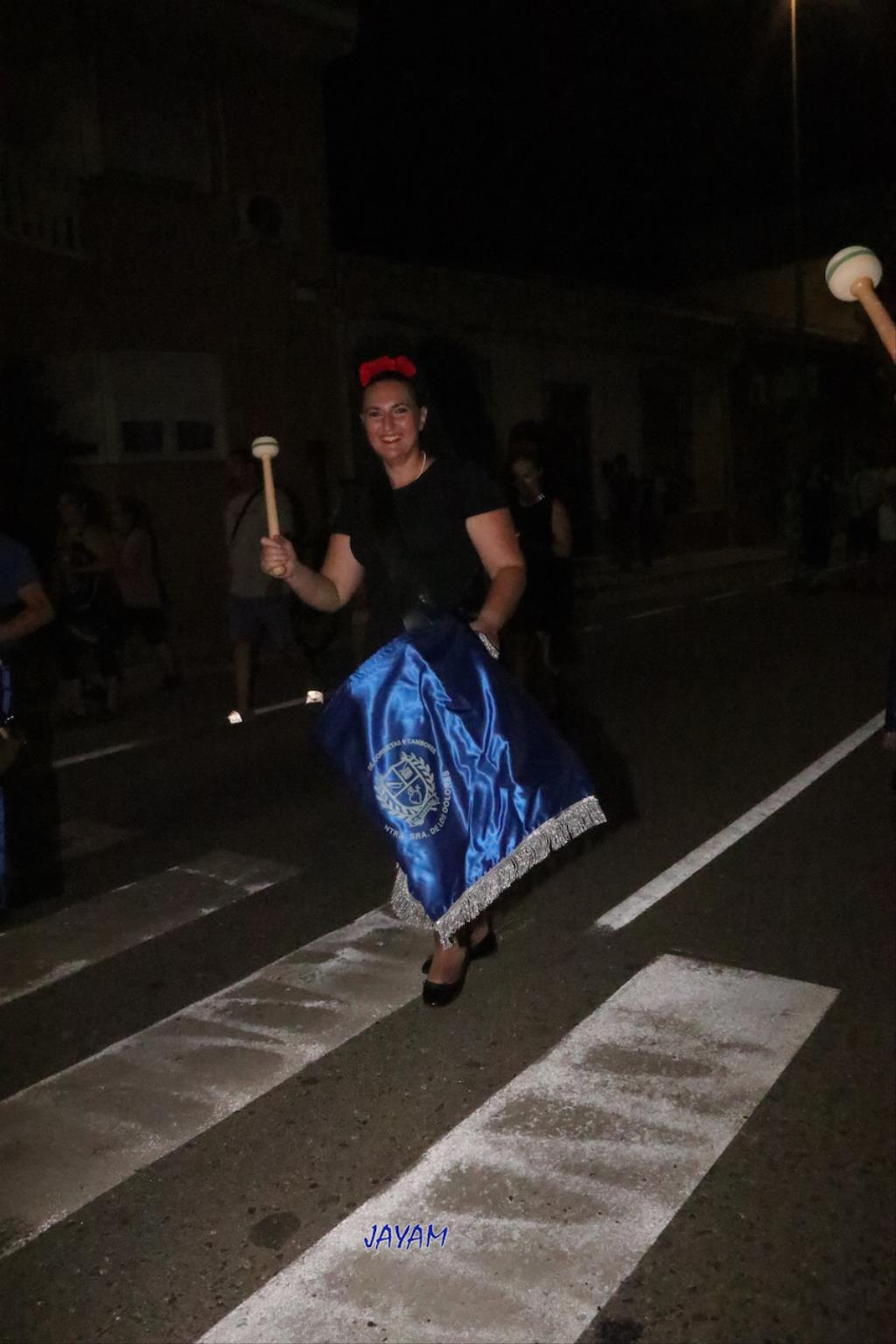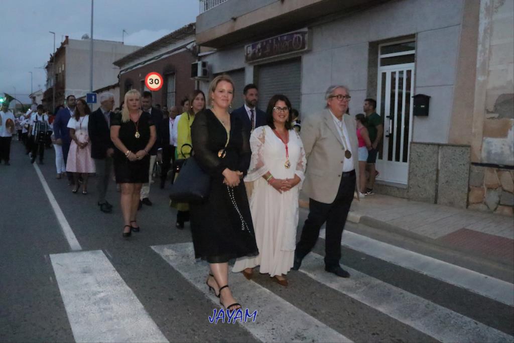 Después, salida del trono con gran expectación y sonido de saetas acompañadas por tambor golpeado por una descalza 'manola' de la banda 'dolorosa' y recorrido por la villa, para a la vuelta, ser cantada la Salve a la patrona al recogerse, culminando el rezo con 'vivas', piropos y aplausos dedicados a la imagen