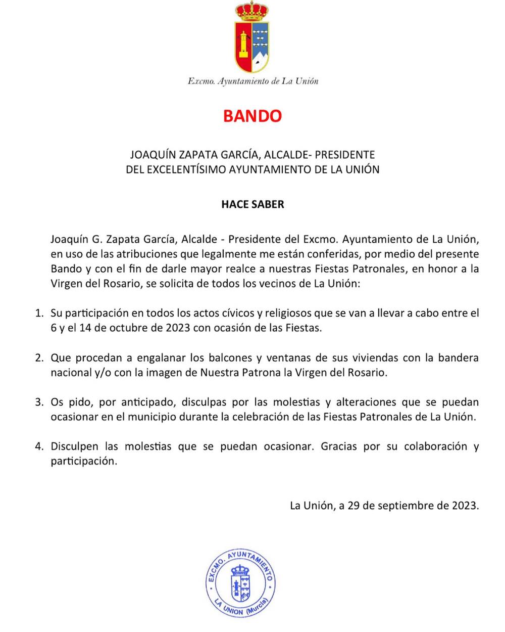 El alcalde de La Unión, a través de un bando, invita a los residentes de la ciudad a participar en los actos cívicos y religiosos de las Fiestas del Rosario, les propone que engalanen balcones y fachadas con las banderas de la Virgen o de España y pide disculpas por las molestias que se puedan producir durante la celebración festera.