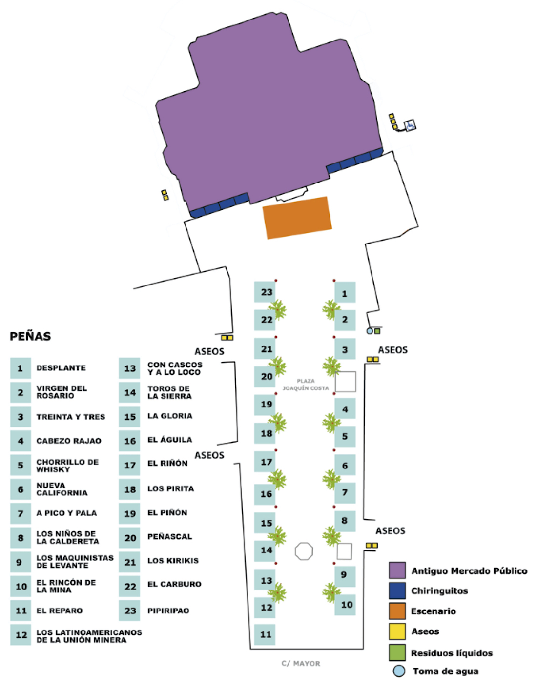 La plaza de Joaquín Costa acogerá en sus dos laterales durante diez días las casetas de los colectivos festeros, que son los mismos 23 que estuvieron en la recuperación de las fiestas en 2022. Su presencia tiene varias facetas positivas, que van desde lo que es vivir estos días dentro de un grupo de amigos hasta enriquecerlas con actividades y concursos que organizan. En la foto, la peña 'Virgen del Rosario'.