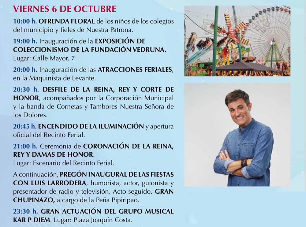 Los festejos en honor a la patrona de la ciudad de La Unión arrancan hoy con el epicentro de la coronación y proclamación de la corte de honor de 2023 y el pregón de Luis Larrodera, un zaragozano polifacético, pues ha sido presentador de radio y televisión (trabajó como tal en 'Un, dos, tres... responda otra vez'), guionista, actor (ha salido en algunos capítulos de 'La que se avecina') y humorista, lo que le trabajo en 2015 al Mercado Antiguo de La Unión para la tradicional noche de los monólogos (fotos adjuntas).