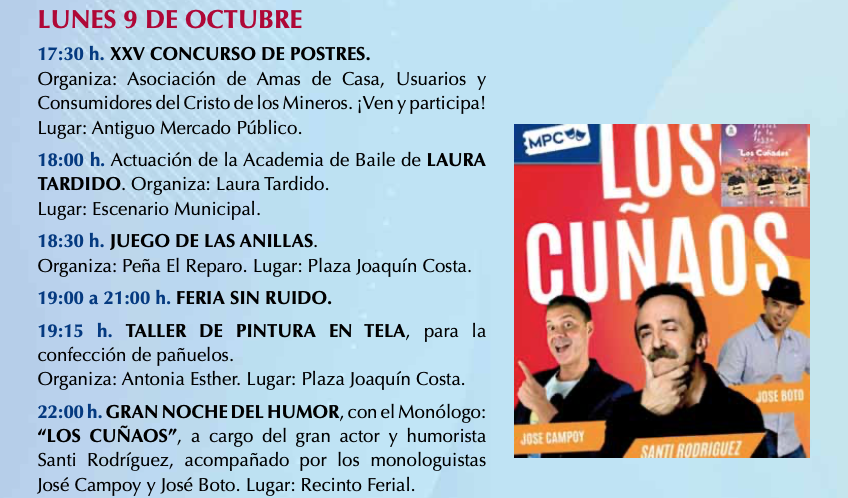 La actividad de las Fiestas del Rosario se centran en la tarde, comenzando por el concurso de postres de la asociación de amas de casa y terminando con la noche de humor de 'Los cuñaos', con los monologuistas José Campoy, José Boto y Santi Rodríguez, quinto saltó a la fama como 'el frutero' de la serie televisiva 'Siete vidas'. También hay exhibición de baile, dos horas de la 'feria sin ruido' y actividades que anuncian las peñas.