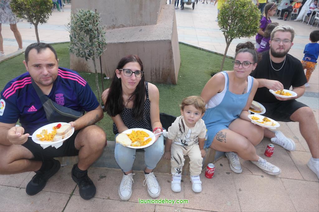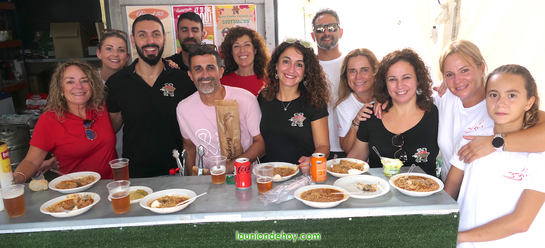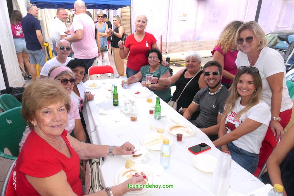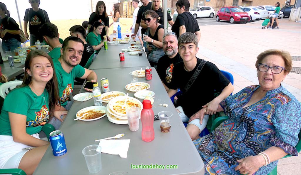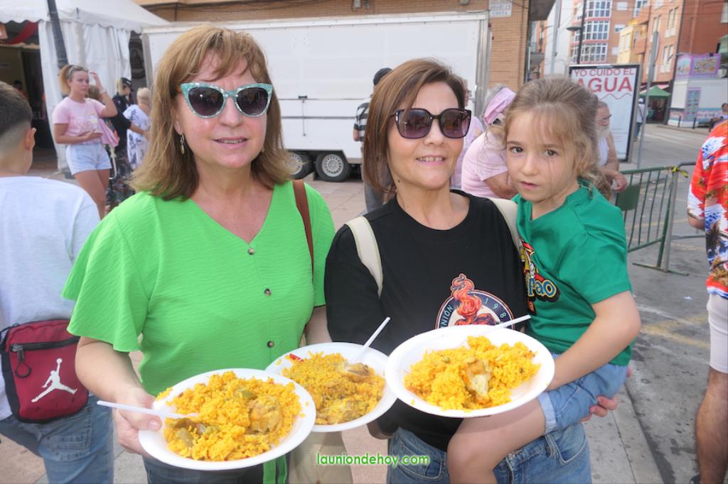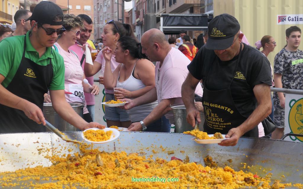 La paellera gigante se vació tras servir mil platos entre peñistas, vecinos y visitantes en un animado mediodía festero, que también contó con calderos y otros manjares elaborados por las peñas, además de tertulias y algún que otro baile.