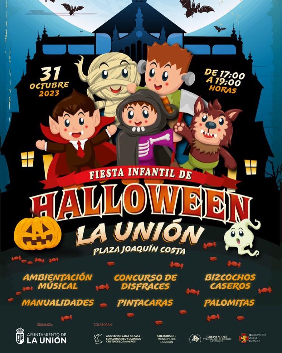 El Ayuntamiento de La Unión organiza la fiesta de 17 a 19 horas en la plaza de Joaquín Costa con disfraces, ambientación musical pintacaras, palomitas y bizcochos caseros, entre otros alicientes. Colaboran la asociación de amas de casa 'Cristo de los mineros', Scout Nuestra Señora de los Dolroes, OJE y colegios del municipio.