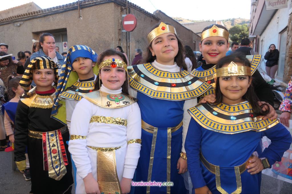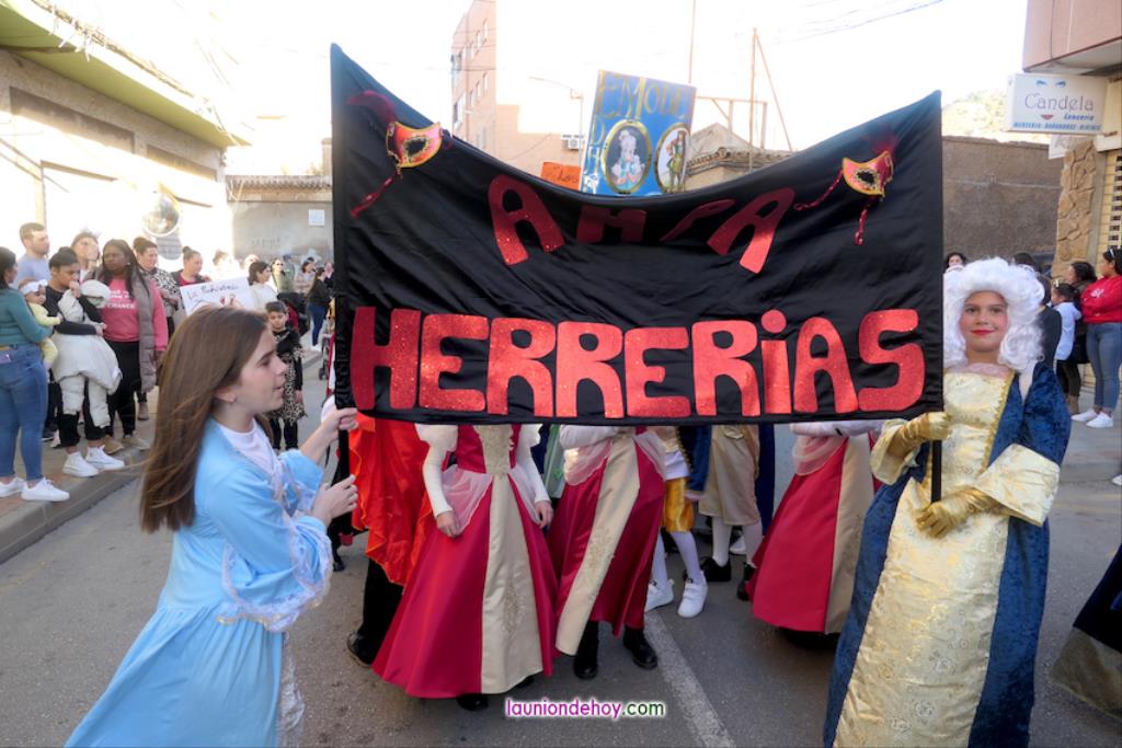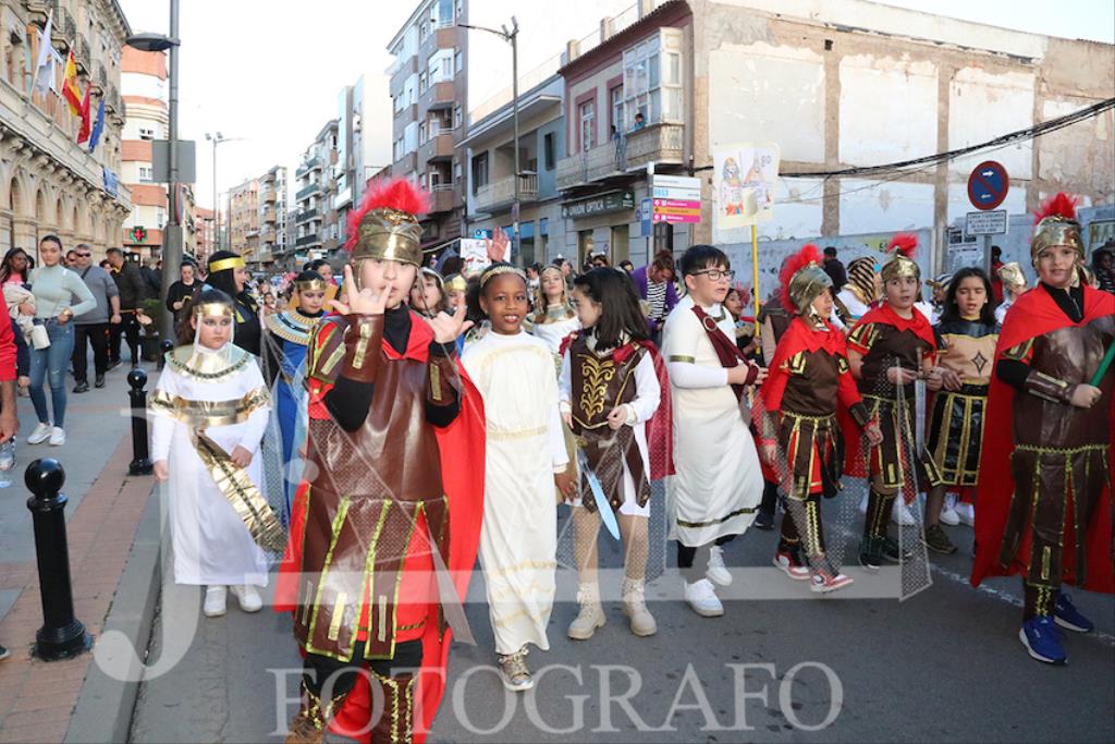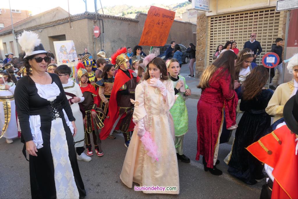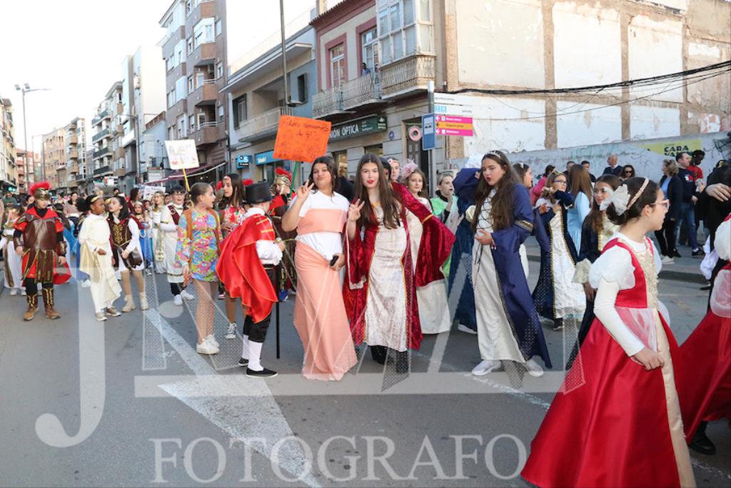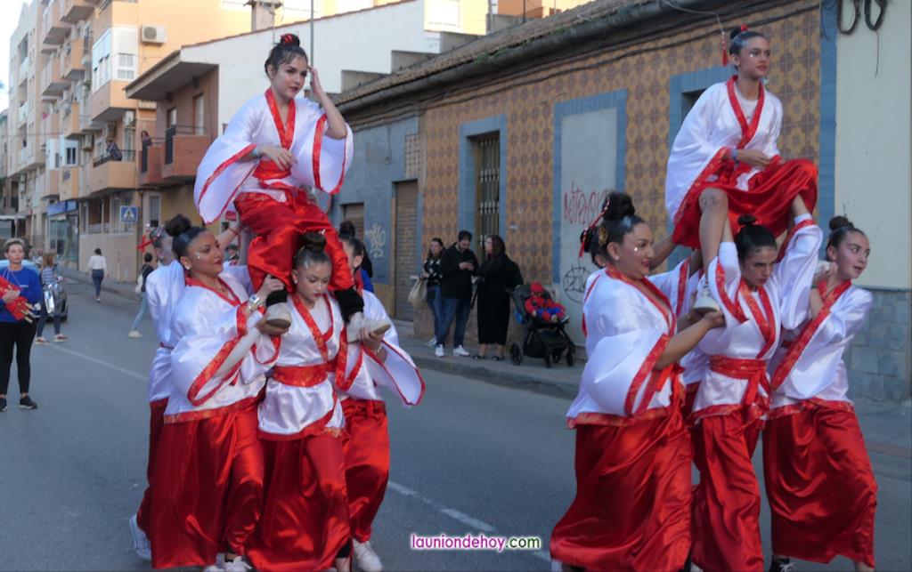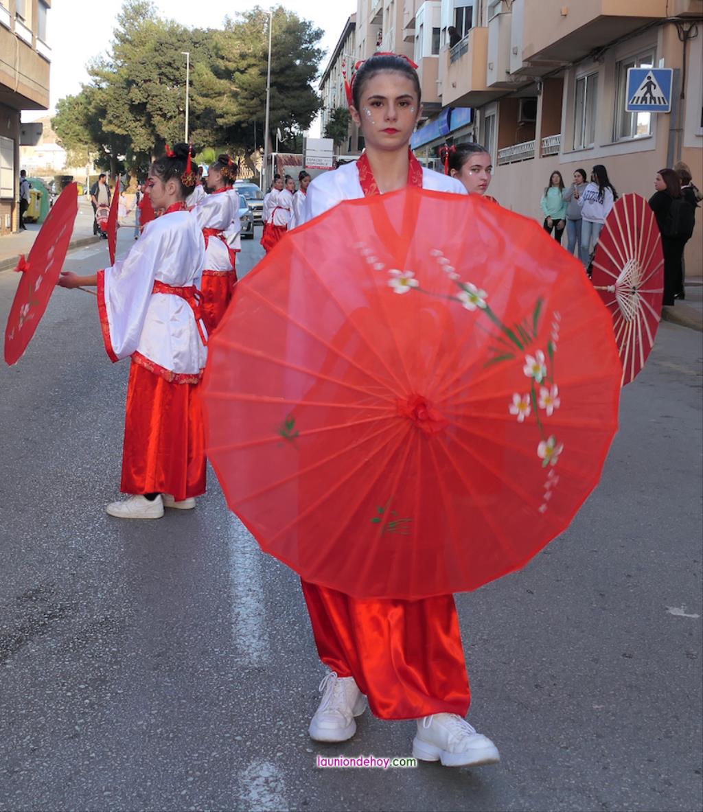 El colegio Herrerías abría la marcha con disfraces que representaban un recorrido por imperios de la historia. Detrás, los bailes de la academia de Laura Tardido y la nueva 'Comparsa con arte' que se ha creado en La Unión, habiéndose estrenado con una treintena de componentes.
