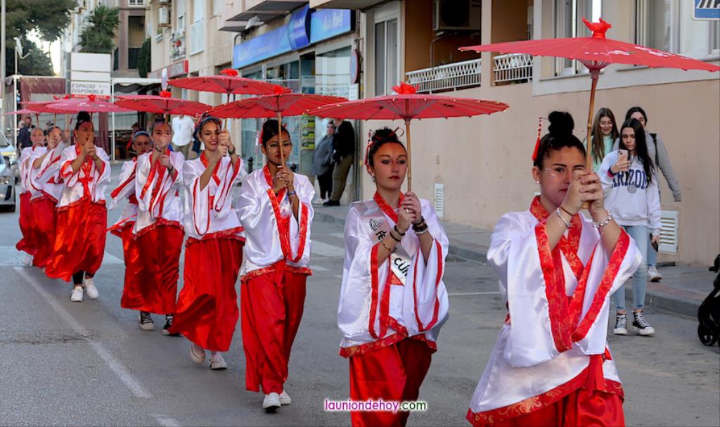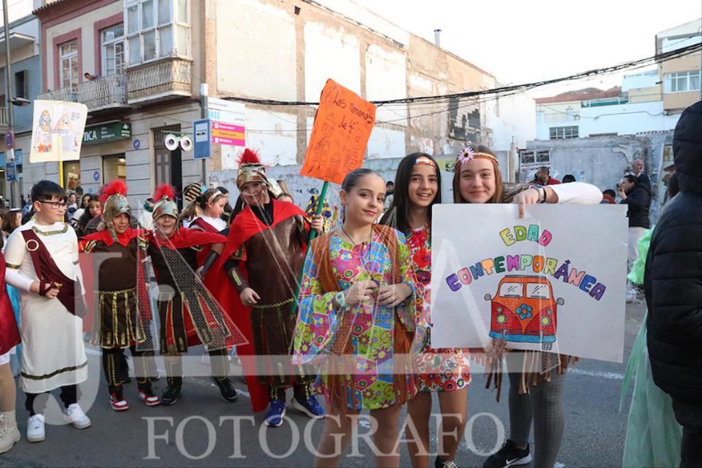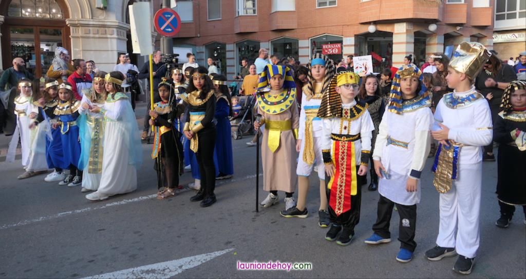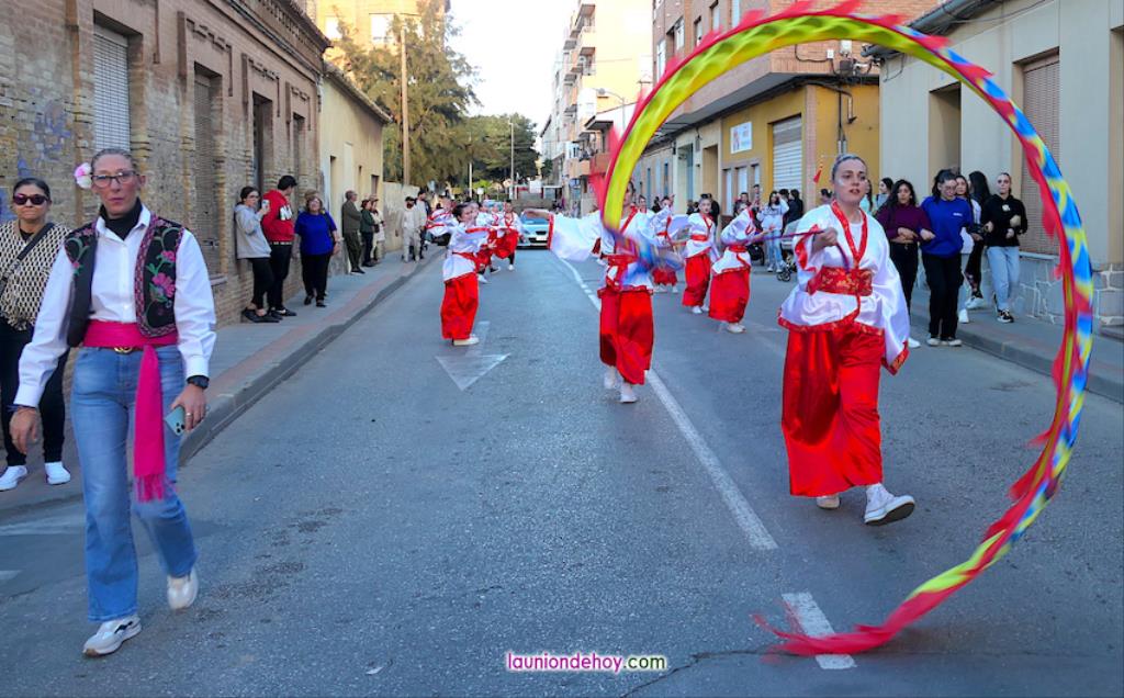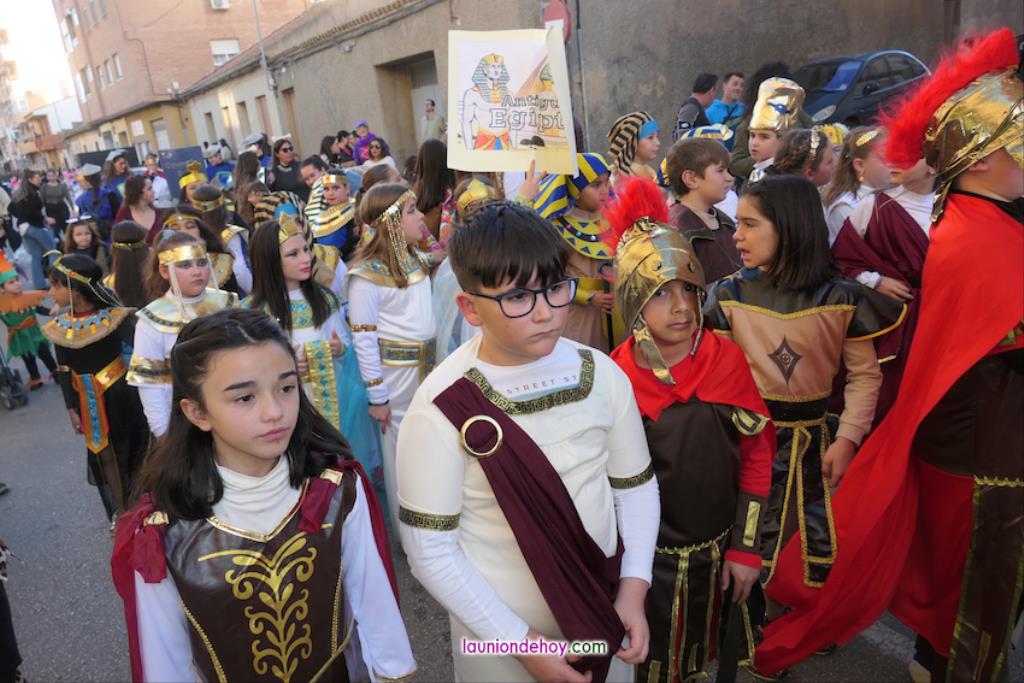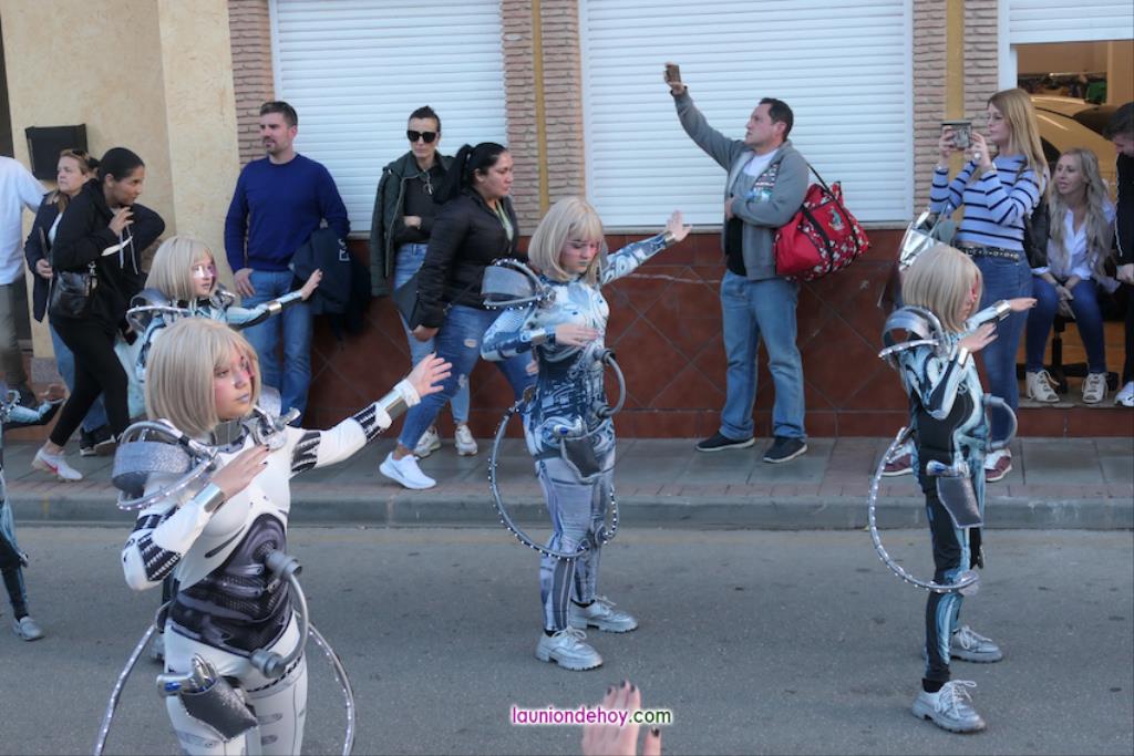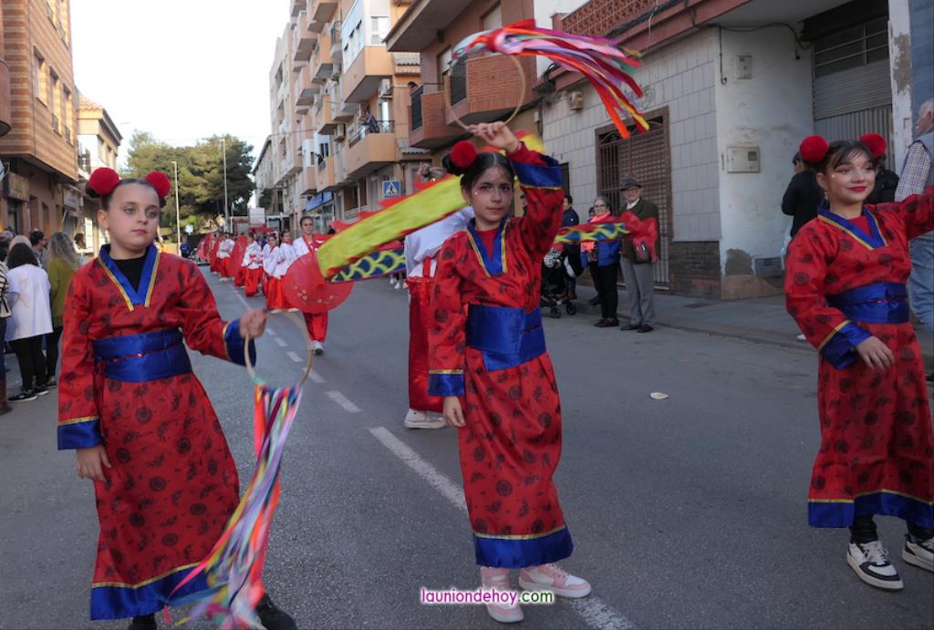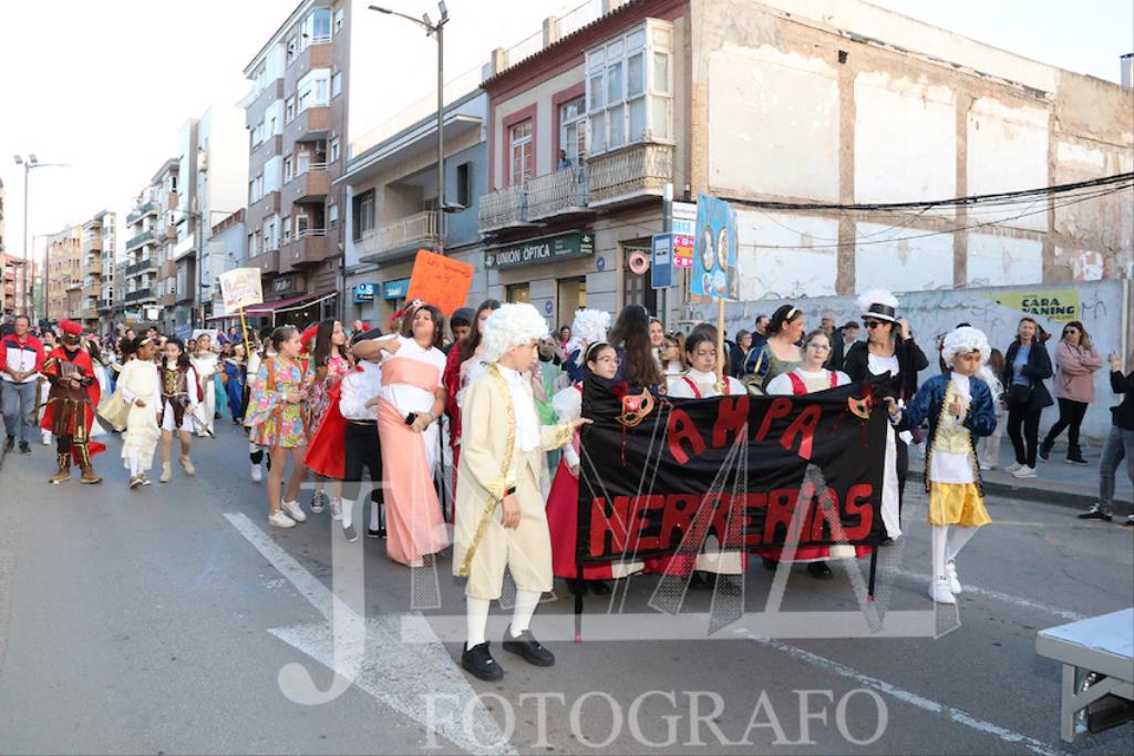 El colegio Herrerías abría la marcha con disfraces que representaban un recorrido por imperios de la historia. Detrás, los bailes de la academia de Laura Tardido y la nueva 'Comparsa con arte' que se ha creado en La Unión, habiéndose estrenado con una treintena de componentes.
