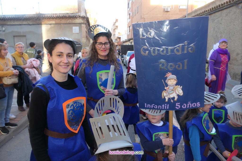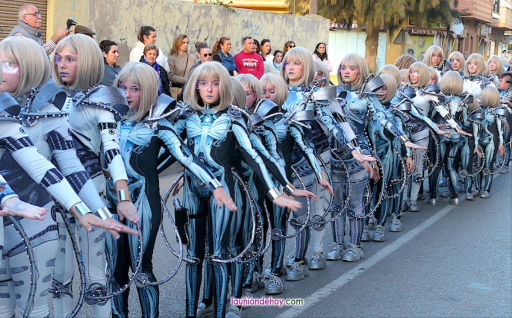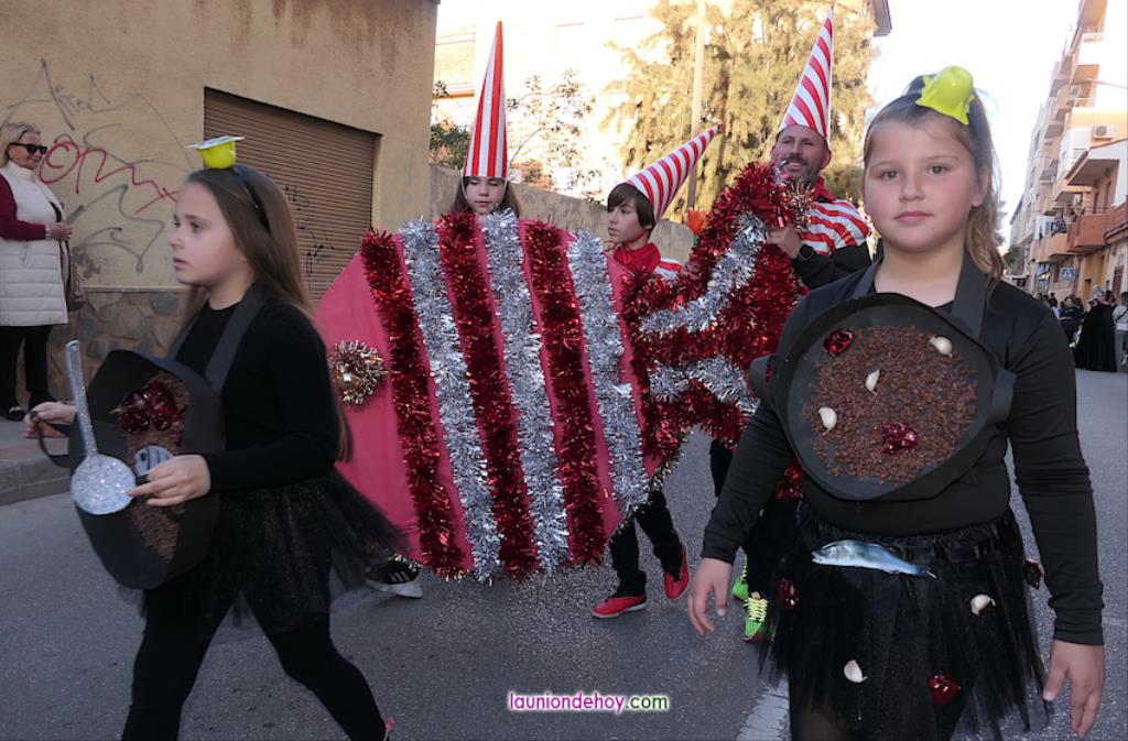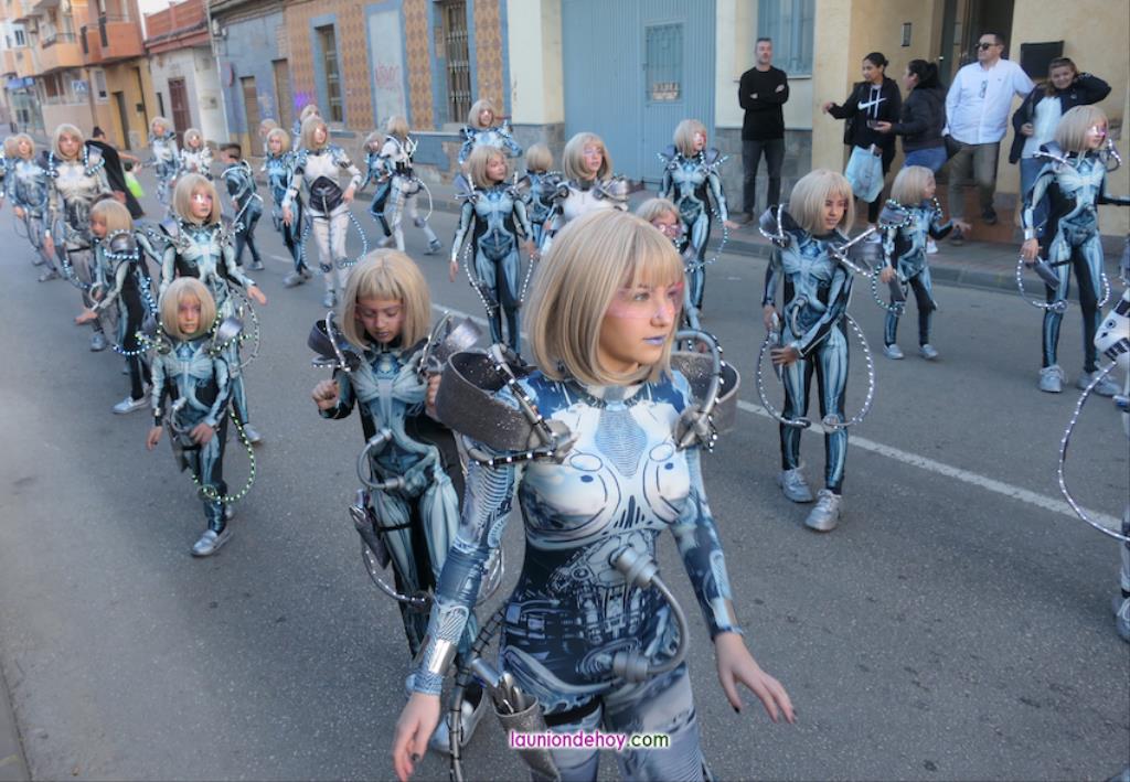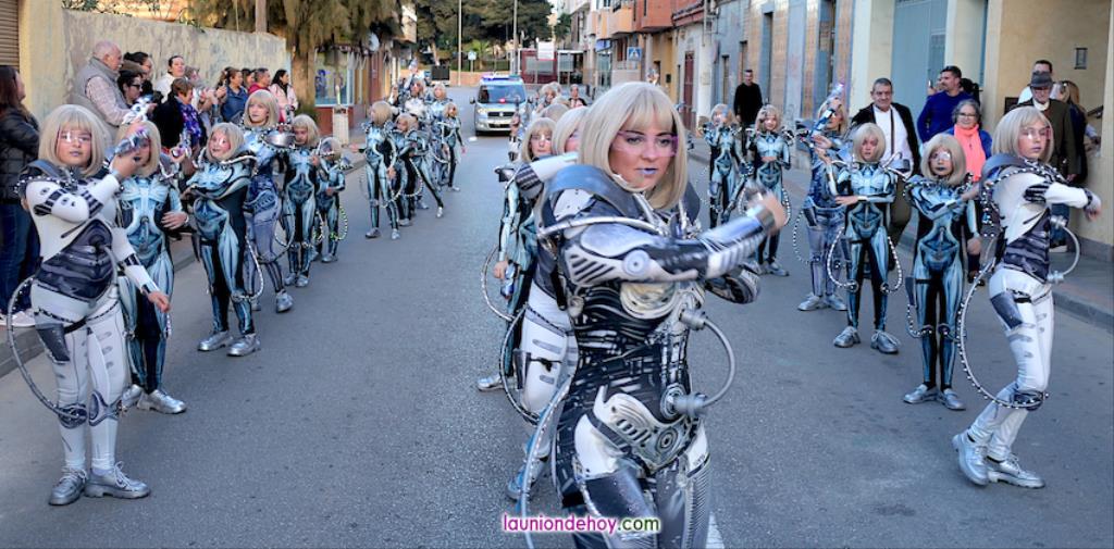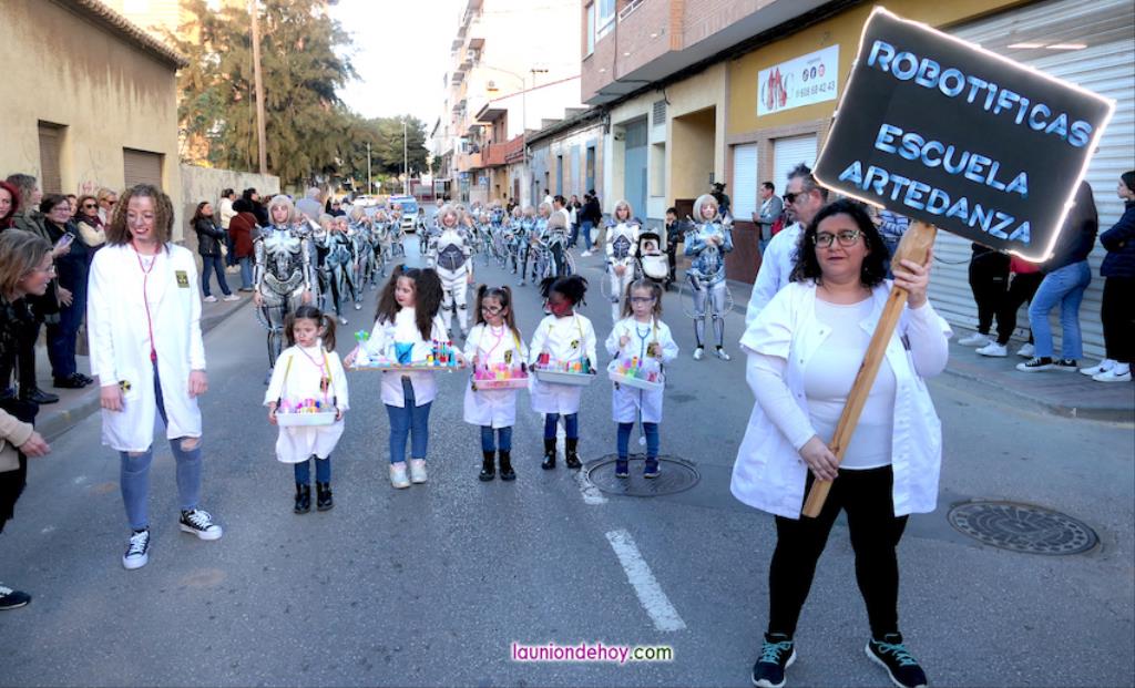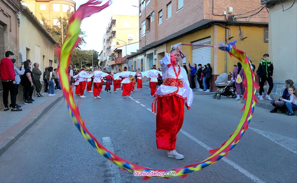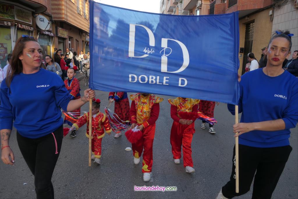 El colegio Herrerías abría la marcha con disfraces que representaban un recorrido por imperios de la historia. Detrás, los bailes de la academia de Laura Tardido y la nueva 'Comparsa con arte' que se ha creado en La Unión, habiéndose estrenado con una treintena de componentes.