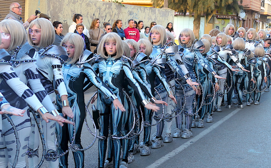 Este último era el grupo más numeroso, con unos ciento veinte componentes, seguido por las centenas (más o menos) de Sabina Mora y Herrerías. Por cierto, amplia mayoría femenina sobre la masculina en la carnavalera comitiva.