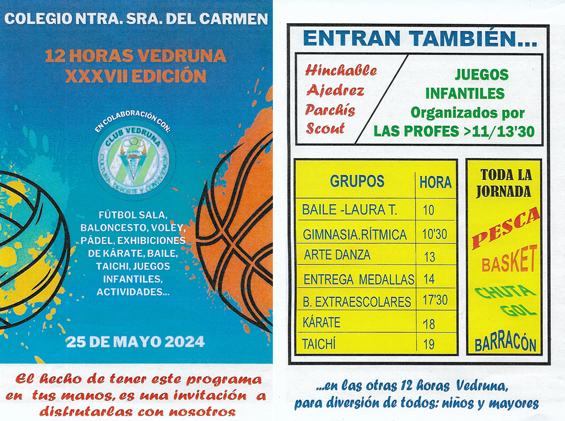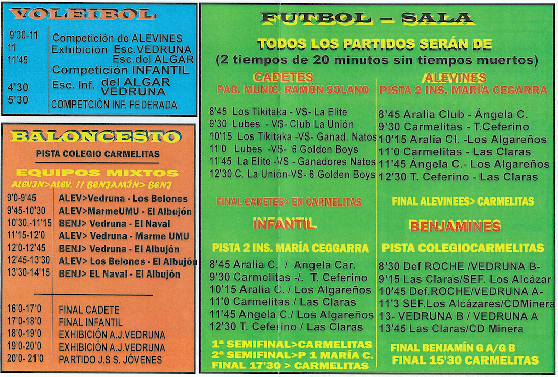 La propuesta de este sábado en el colegio de Carmelitas incluye competiciones de voleibol, baloncesto y fútbol sala con equipos locales y foráneos procedentes de El Algar, Los Belones, Cartagena, San Javier y Los Alcázares, entre otros, además ajedrez, parchís, juegos (pesca, chuta gol, barracón, etc.), exhibiciones de baile, kárate, pádel y taichí, hinchables y actividades scout, dentro de un amplio programa dirigido a pequeños y mayores.