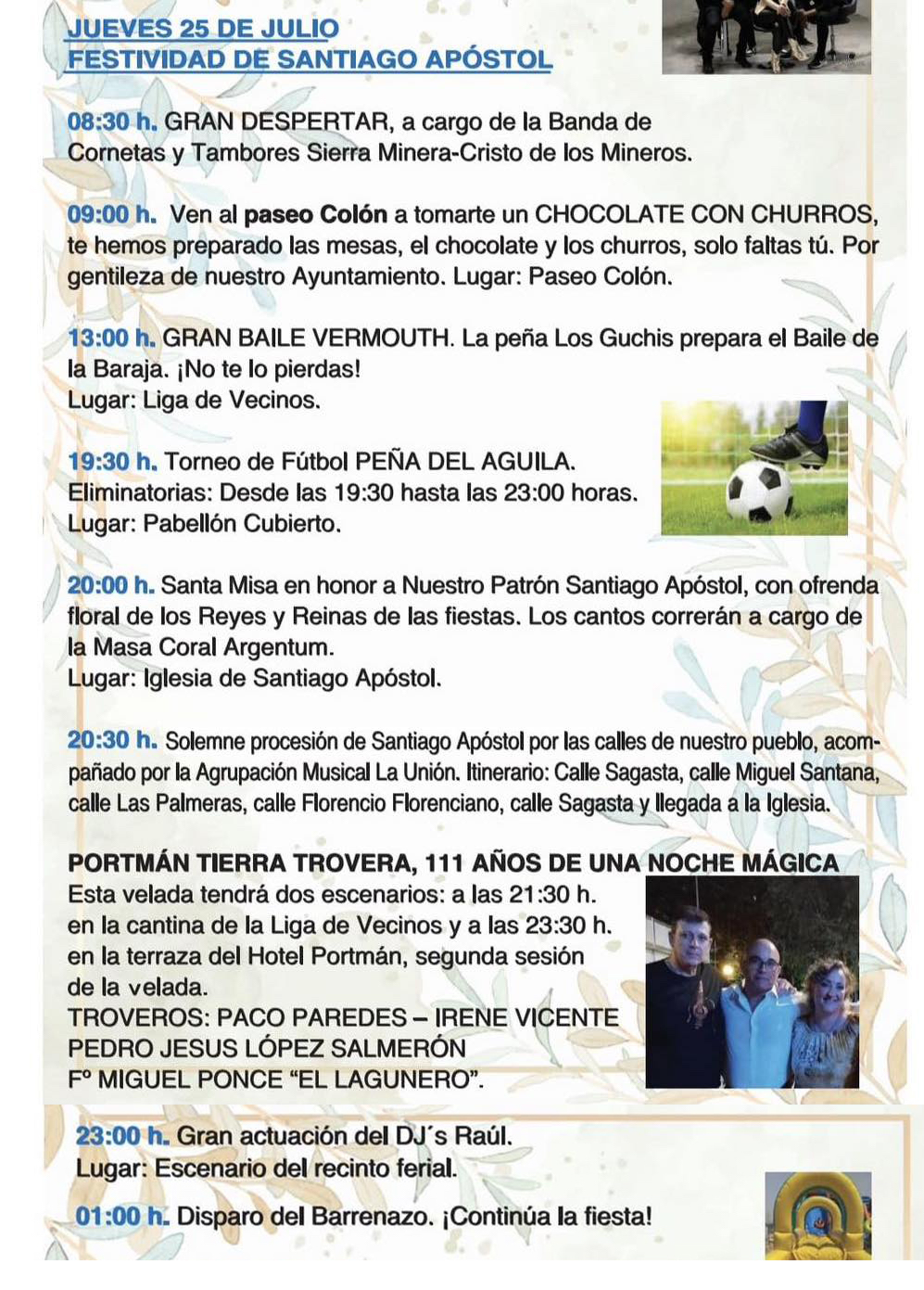 Hoy es fiesta en el municipio de La Unión y la gran celebración del apóstol patrón de Portmán, donde hay actividades diversas toda la jornada, destacando la procesión de la tarde y la velada trovera de la noche.
