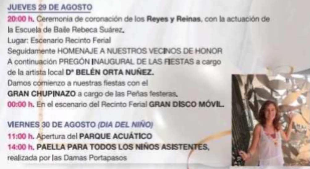 El programa oficial de 2024, que se prolongará hasta el domingo, arranca a las ocho de esta tarde con la ceremonia de coronación de la corte real, la actuación de una escuela de baile, el homenaje a los vecinos de honor y el pregón de la artista local Belén Orta (foto adjunta), además del gran chupinazo a cargo de las peñas. La circulación en las calles del entorno del recinto festero se verá interrumpida hasta el domingo durante la celebración de las actividades.