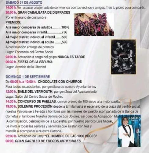 La tarde-noche del sábado es para la cabalgata de disfraces con noche con música en directo y fiesta de la espuma, mientras que el domingo arrancará con chocolate con churros y continuará con el vermú y el concurso de arroces. Por la tarde llegará la procesión con Nuestra Señora de los Dolores y la velada nocturna será para reír con Larry y ver el castillo de fuegos artificiales.