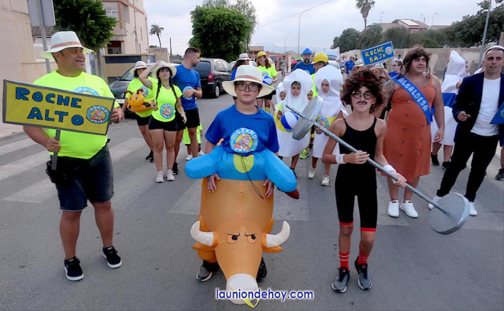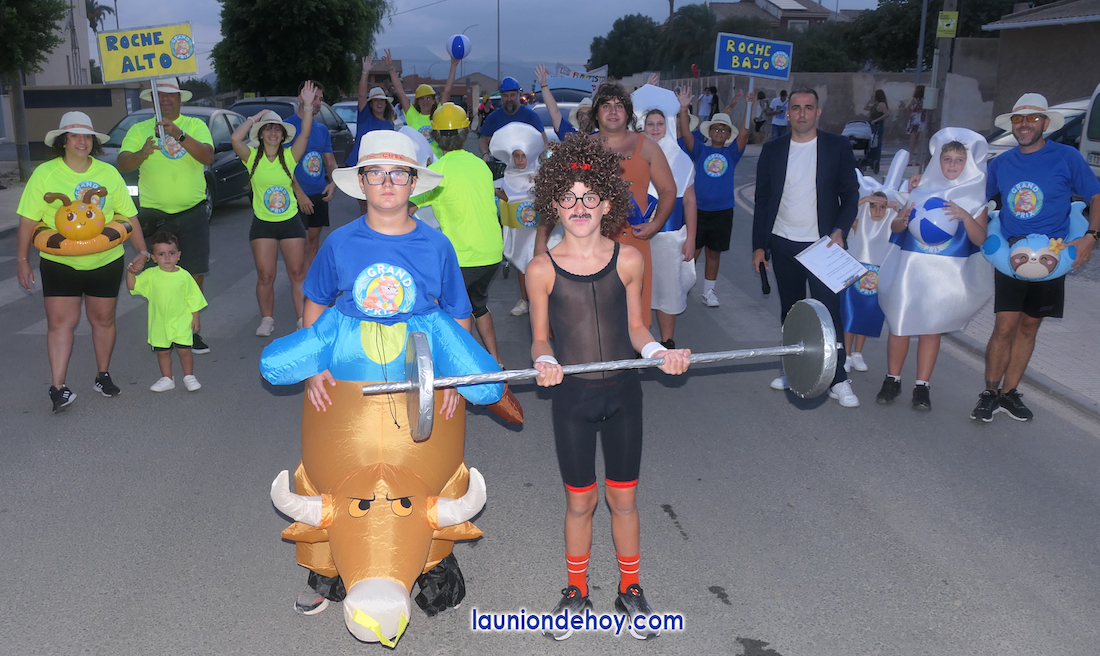 'Roche Alto' contra 'Roche Bajo' fue el duelo representado por la peña 'Los Antoni@s' en el desfile de disfraces rocheros. Ahí estuvieron, además de la alcaldesa, el presentador Ramón García, el elástico Wilbur, los bolos humanos y la vaquilla, entre otros, además de la representación de los dos pueblos con camisetas amarillas y azules con el escudo del 'Grand Prix'. El resultado es que la peña consiguió el primer premio de 100 euros del concurso de disfraces.