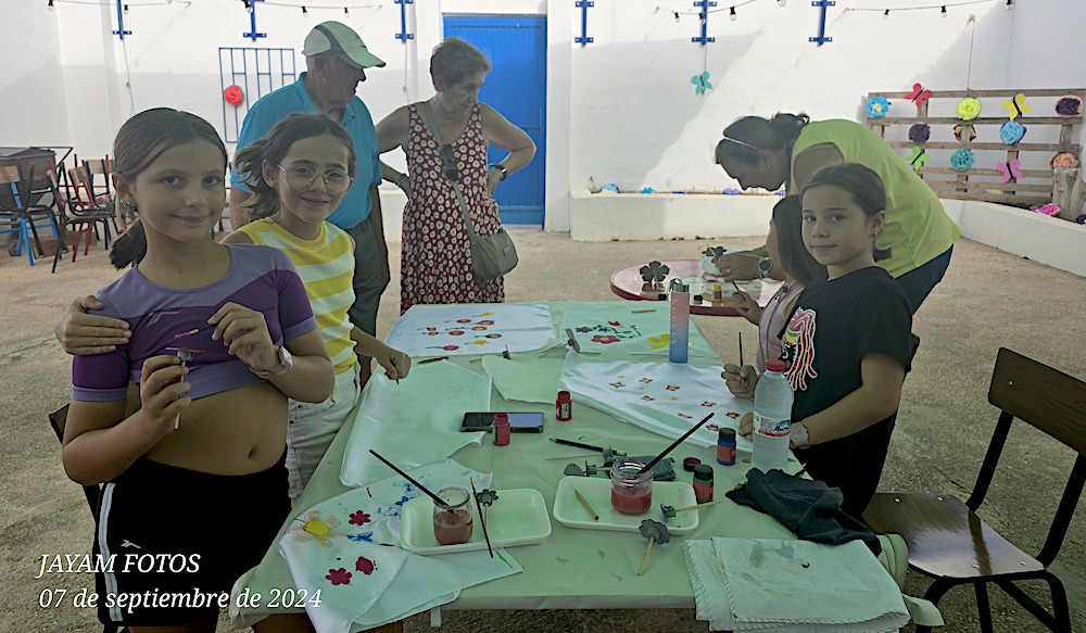 Durante la elaboración de los pañuelos en el patio de las asociaciones de vecinos y de amas de casa, las niñas han disfrutado pintando y compartiendo un rato muy agradable con algunos miembros del colectivo, incluida la presidenta.