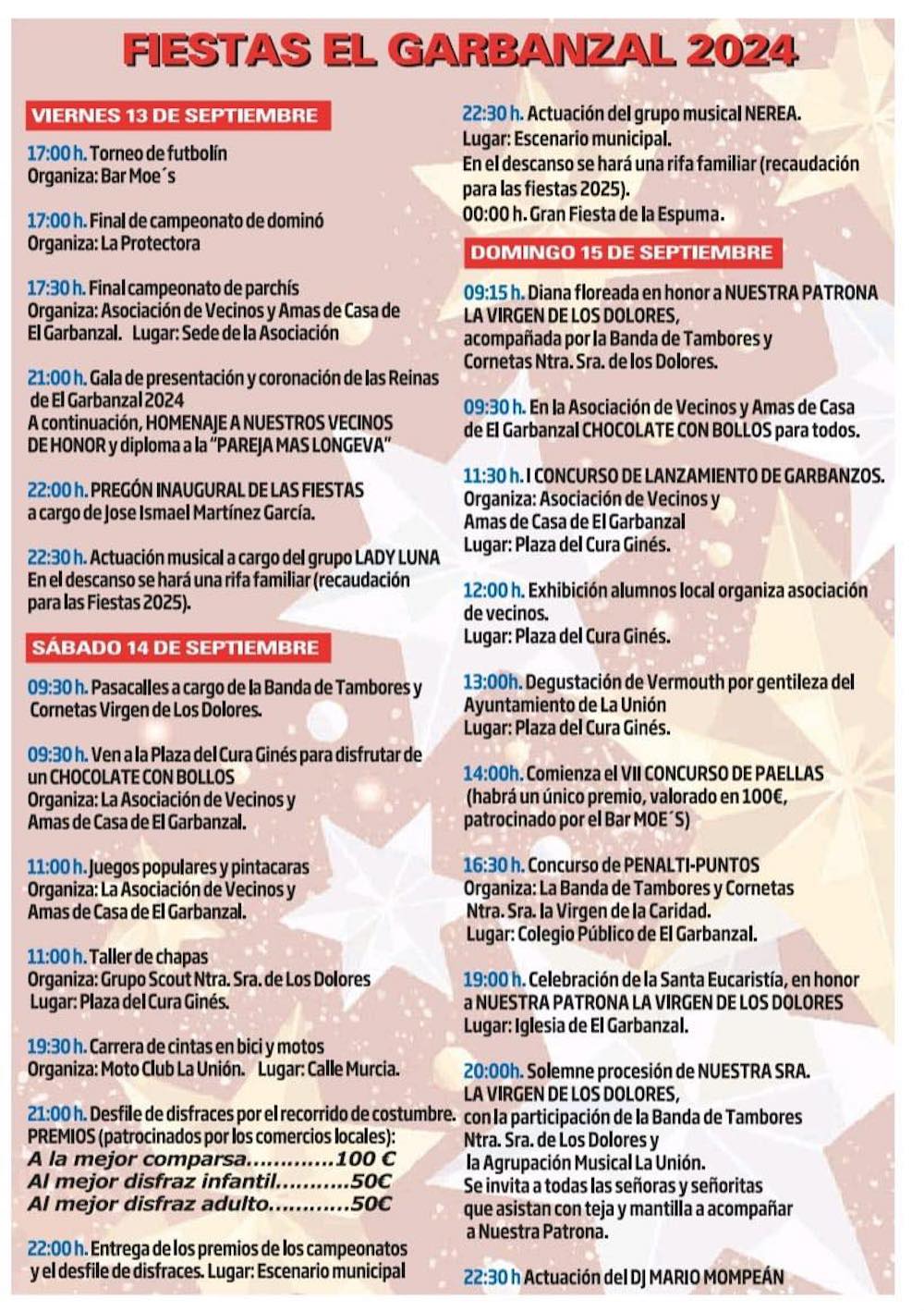Hoy comienzan tres jornadas de convivencia vecinal en torno a las actividades preparadas por el Ayuntamiento de La Unión en el recinto festero tradicional y que se enriquecen con las organizadas por las asociaciones de vecinos y de amas de casa además de los scout, banda 'Virgen de la Caridad', La Protectora y Moto Club La Unión. El pregonero será esta noche José Ismael Martínez García durante la gala de coronación del cuarteto de reinas de 2024. La vía principal tendrá muy restringido el tráfico estos días.