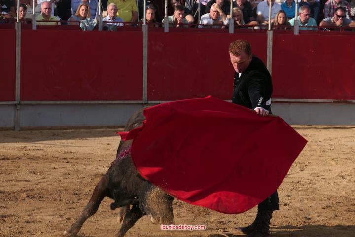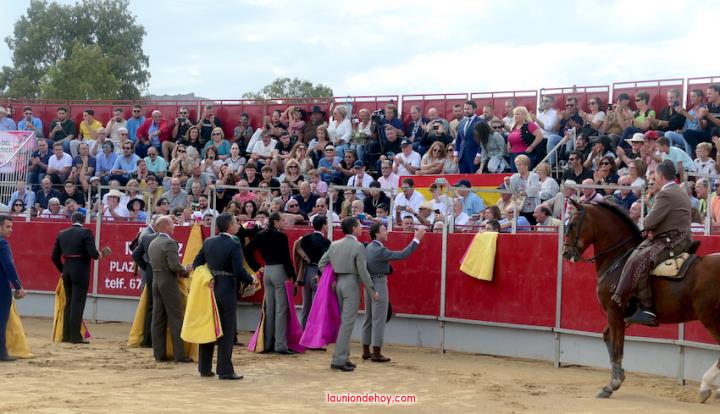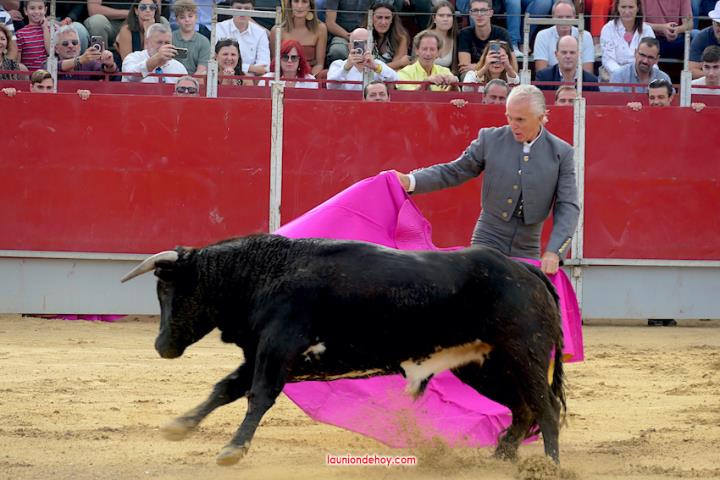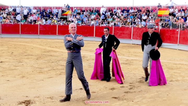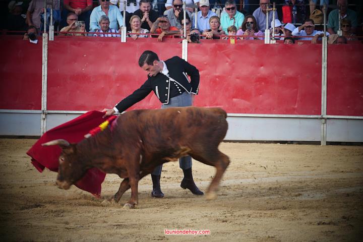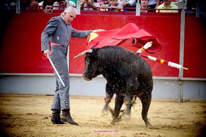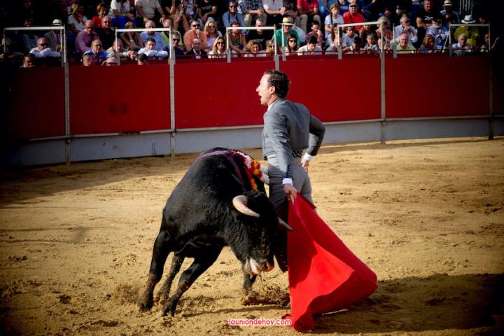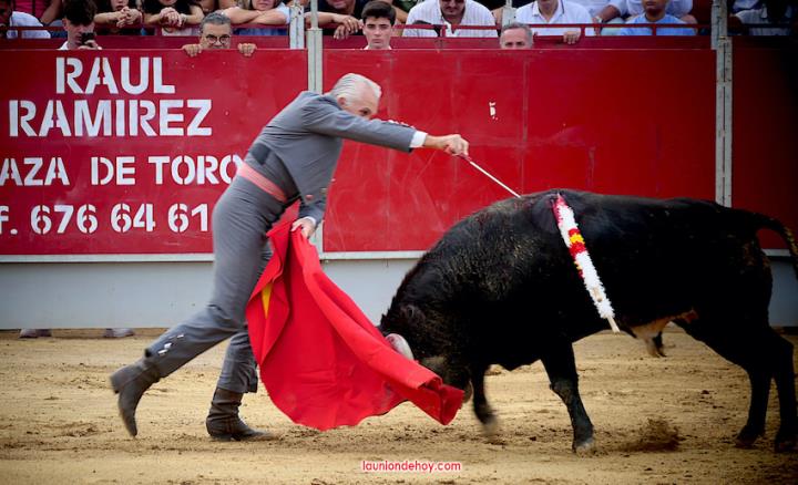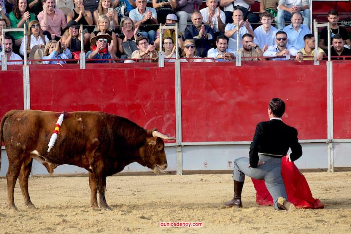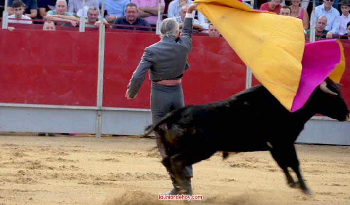 El murciano Manolo Cascales, quien celebraba el 40 aniversario de cuando tomó la alternativa, fue el primer torero que ‘abrió el fuego’. Enfrente tuvo un toro que sufrió demasiados caídas, no sé si por el agua caída pocos antes del cielo o por circunstancias del novillo que le tocó en suerte. Pronto arrancó los ‘olés’ y aplausos al público con su arte, pero, aunque el estoque entró bien desde el principio, necesitó tres intentos para matar a su adversario. Oreja y vuelta al ruedo. El público pidió más, al igual que hizo después con los que le fueron sucediendo sobre el albero.