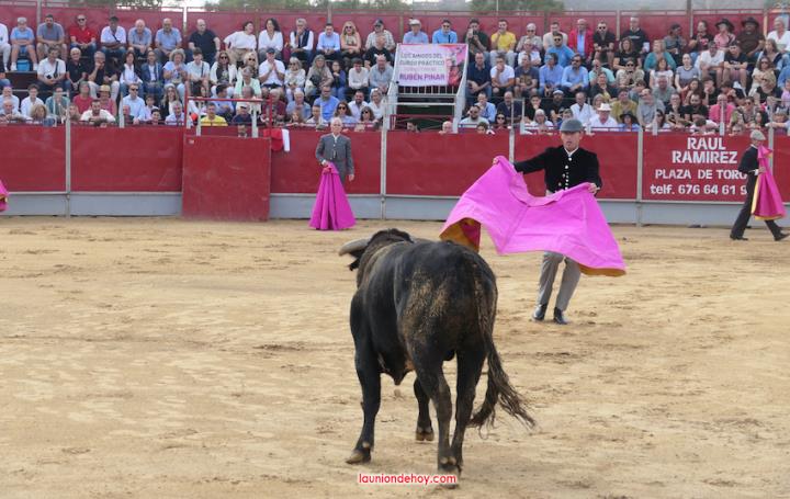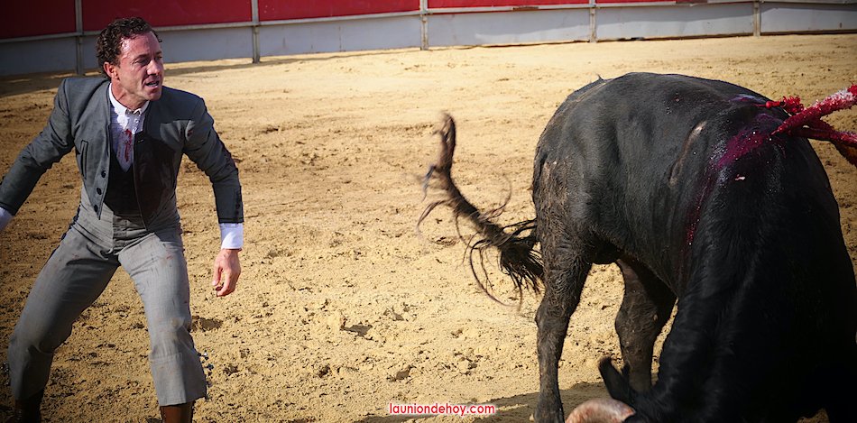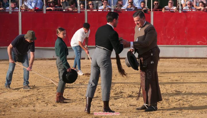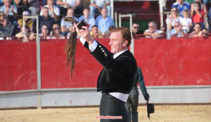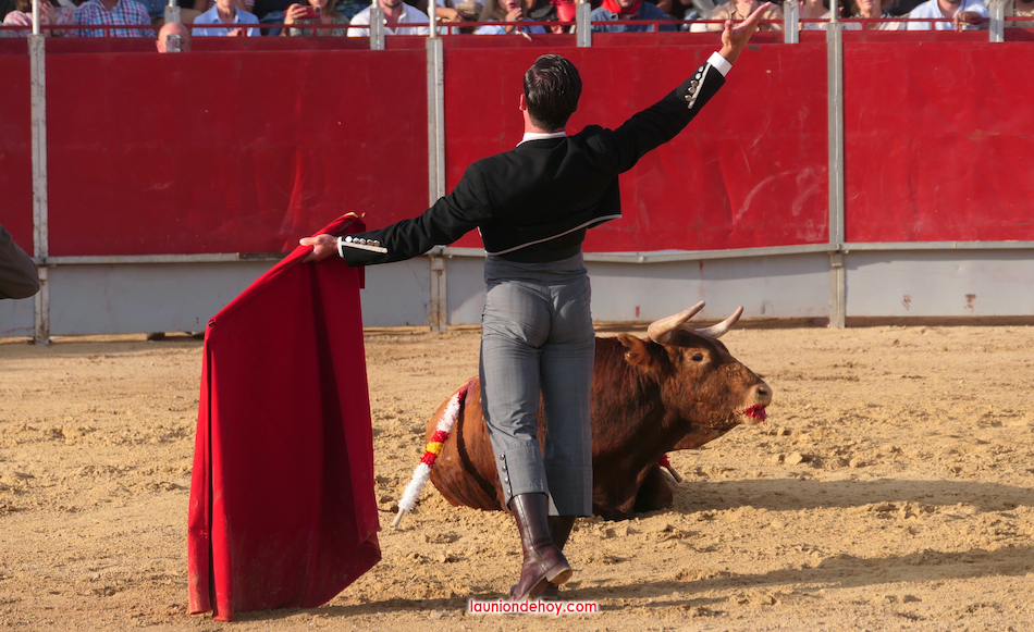 El final de la actuación del manchego Rubén Pinar fue similar, pues también estuvo acompañado por sus herederos y conquistó las dos orejas y el rabo, también tras presión popular. Gustó mucho las repetidas veces que el de Albacete puso la rodilla en el suelo y acertó con el estoque a la primera, falleciendo el novillo a cámara lenta.