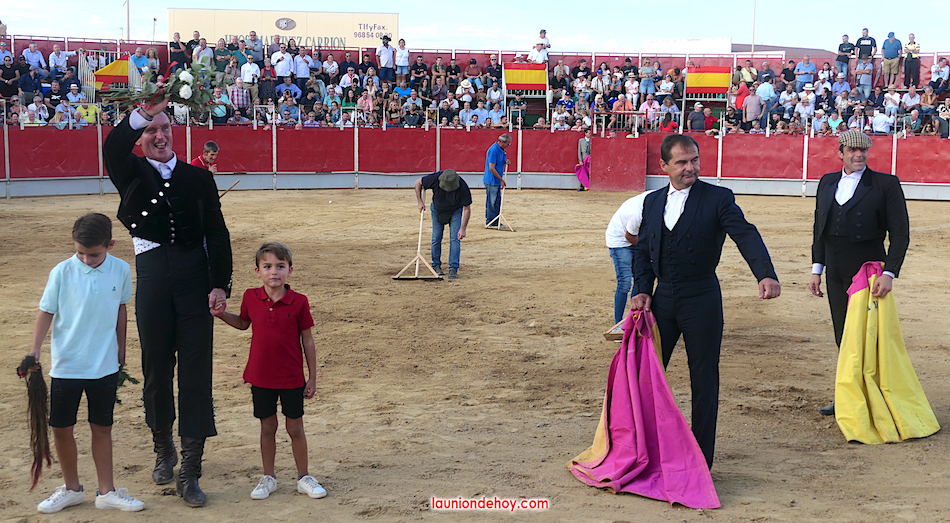 El festival dejó una estupenda tarde taurina tanto por el ambiente como por el nivel ofrecido por los cuatro toreros y un novillero, ofreciendo también escenas emotivas y familiares de sus protagonistas, con las vueltas al rueda que dieron Alfonso Romero y Rubén Pinar con sus hijos y la que dio Rafaelillo (foto adjunta) con el banderillo José Mora, quien en julio sufrió una gravísima cogida.