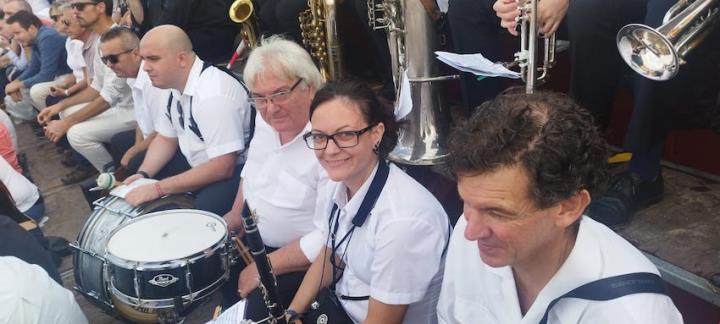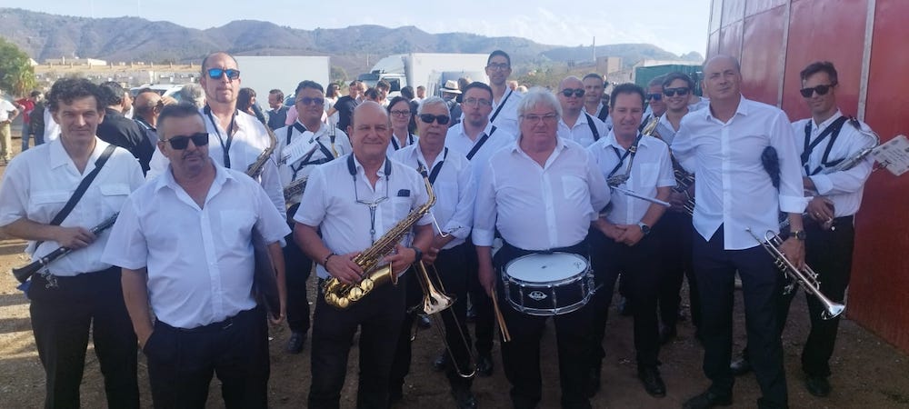 Escuadrón de la Agrupación Musical 'Cartagena 1990' que puso el capítulo musical. Abajo, José Tudela con Rafaelillo