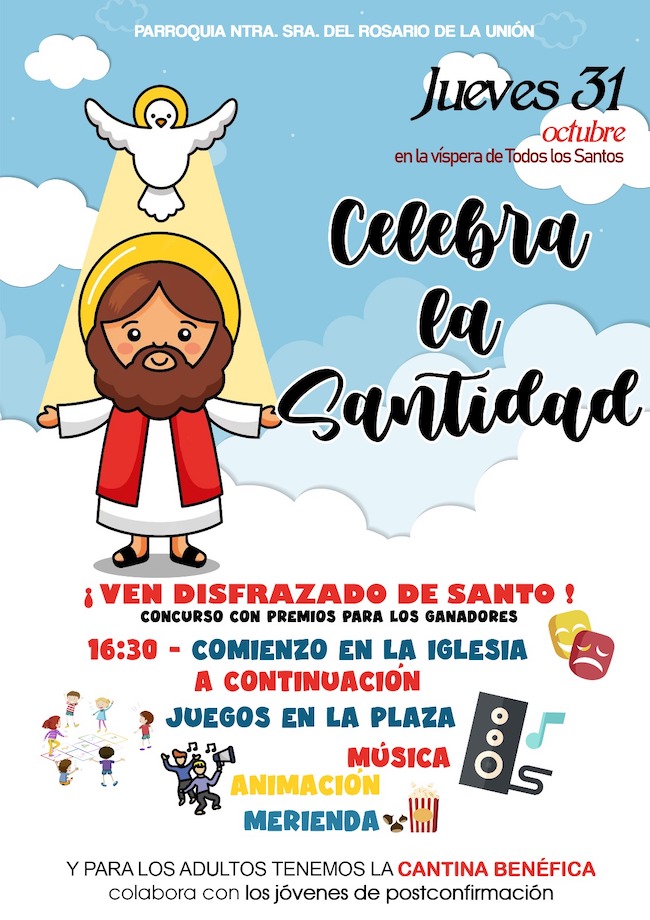 La fiesta de la santidad 'Holywins' ('la santidad gana'), que tendrá lugar nuevamente este jueves en la parroquia de Nuestra Señora del Rosario en la víspera de la festividad de 'Todos los santos', cumplirá cinco ediciones en La Unión. Tras un primer capítulo en la iglesia, habrá después juegos en la plaza con música, merienda y animación, además de premios para los que mejor vayan disfrazados.