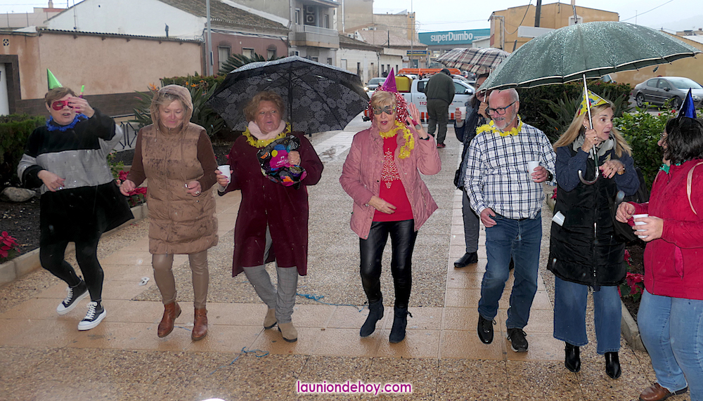 Las preuvas organizadas por las asociaciones de vecinos y de mujeres de El Garbanzal en la mañana del 31 de diciembre sufrieron la presencia de la lluvia, pero no mermó la alegría de los organizadores, como se observa en este animado grupo con pasos de bailes coordinado mientras llovía.