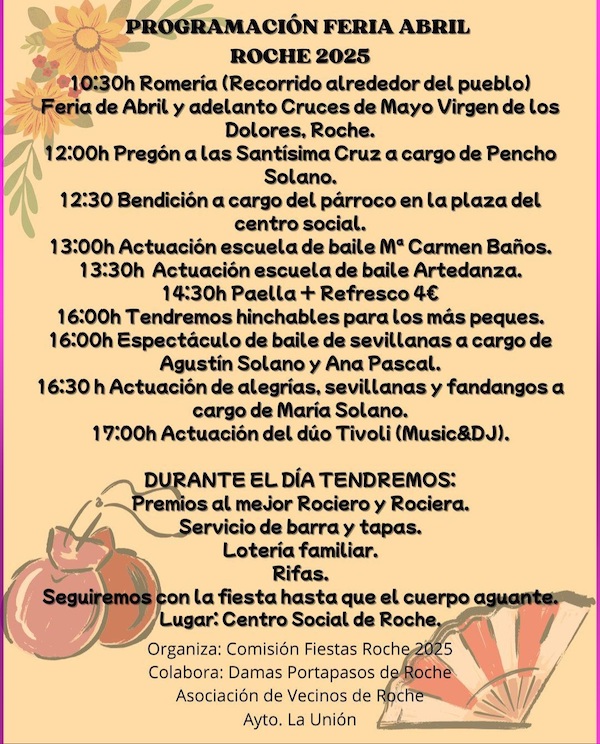 El conocido vecino, quien este año también distinguido como 'Romero de honor' de la cartagenera villa de San Antón, será la primera persona que pregone la nueva fiesta rociera rochera el próximo 26 de abril en una jornada que se abrirá con una romería y que tendrá diversas actuaciones musicales, incluido un baile de sevillanas con caballo dirigido por Agustín Solano con la bailaora Ana Pascal. El programa también incluye cruz de mayo, hinchables, arroz, etc.