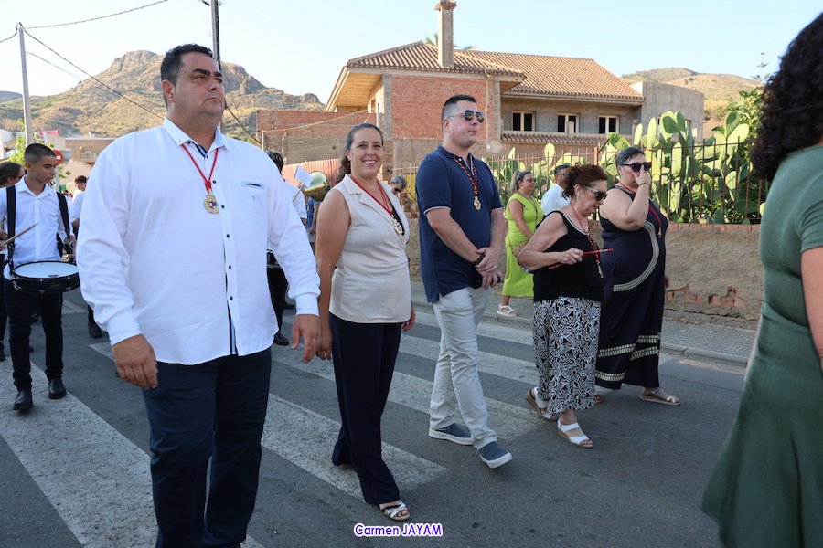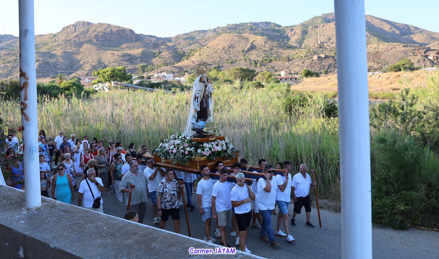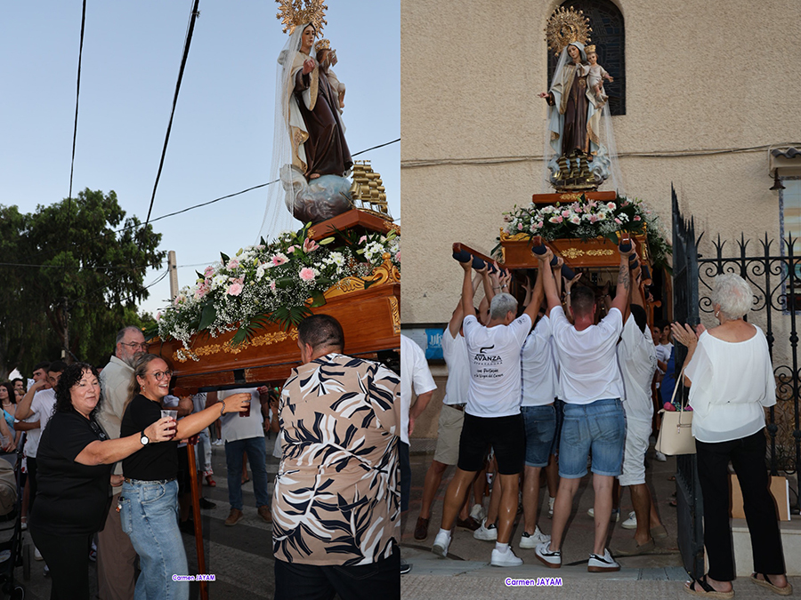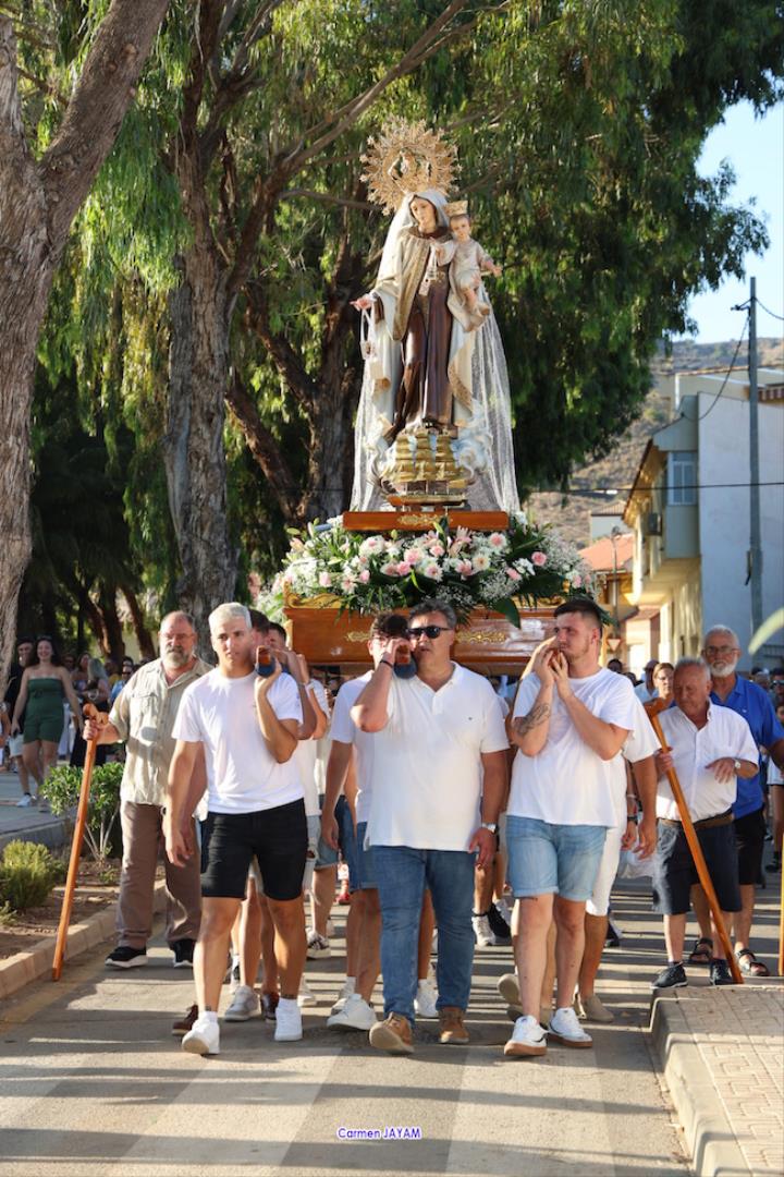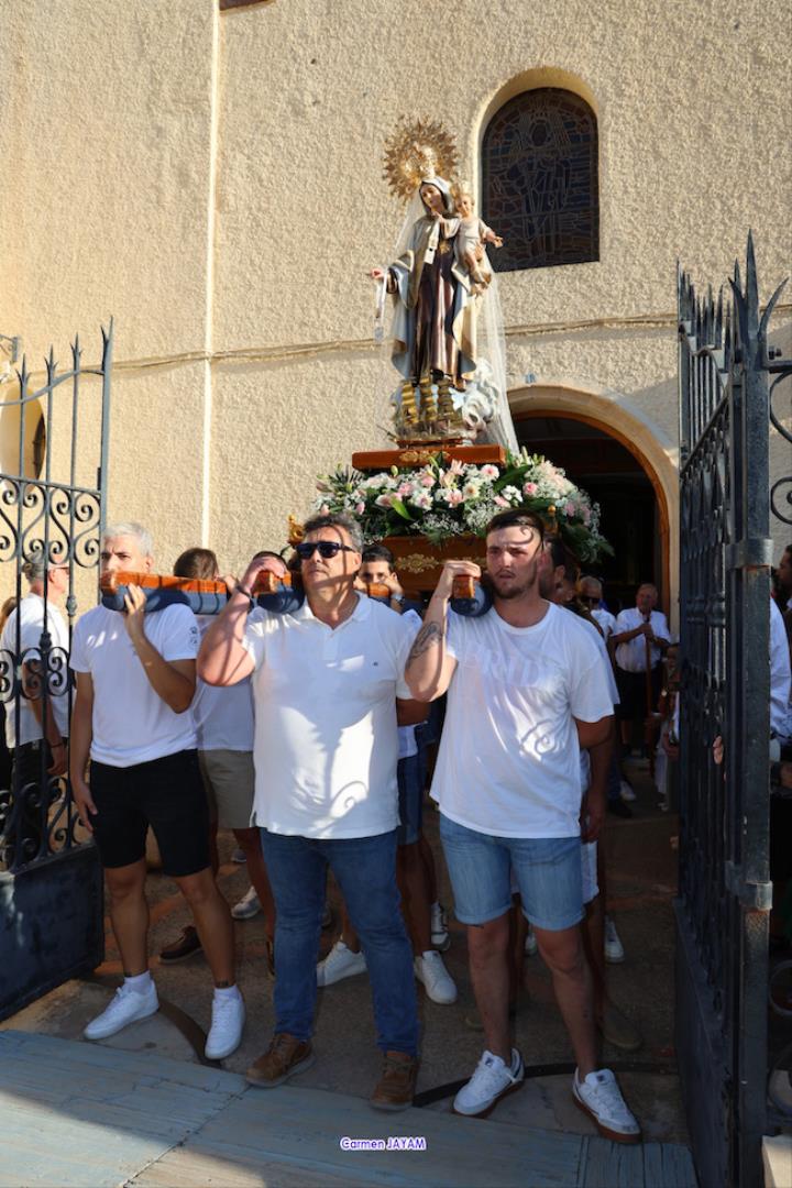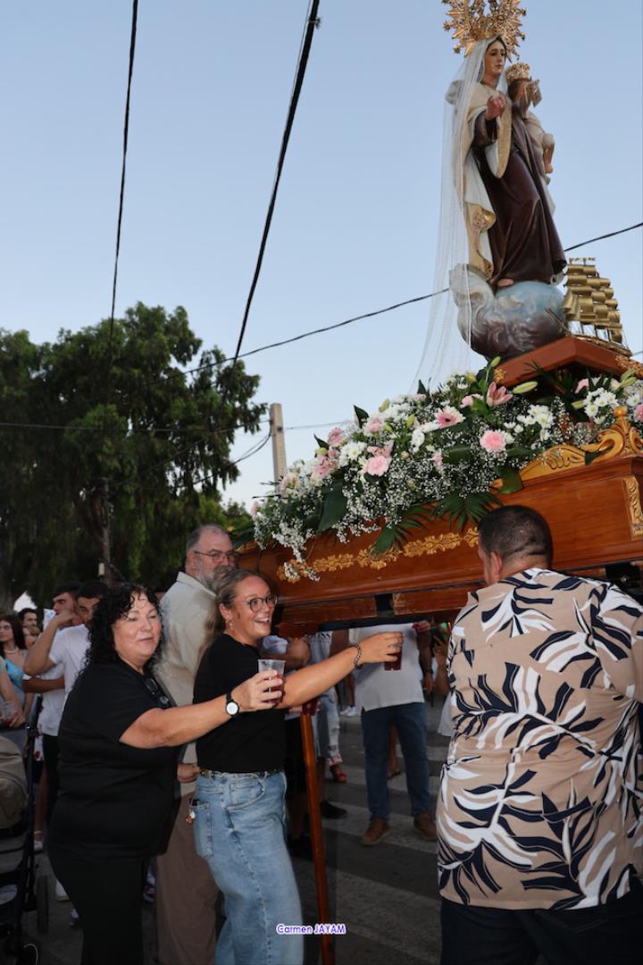 La Virgen del Carmen volvió a 'navegar' por calles y caminos de su pueblo arropada por su fieles, ante los que se celebró una eucaristía en el puerto, para a su conclusión, la solemnidad del trayecto de ida convertirse en alegría con animada música y 'bailes' del trono, cuyos costaleros esta vez tuvieron dos puntos de avituallamiento de refrigerios.